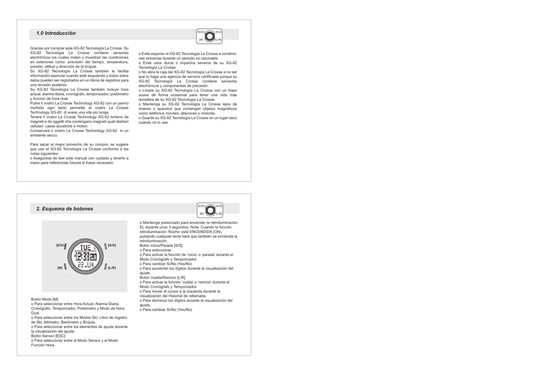 Gracias por comprar este XG-82 Tecnología La Crosse. Su XG-82 Tecnología La Crosse contiene Senseores electrónicos los cuales miden y muestran las conditiones en exteriores como: provision del tiempo, temperatura, presión,altitude y direccion de la brújula.