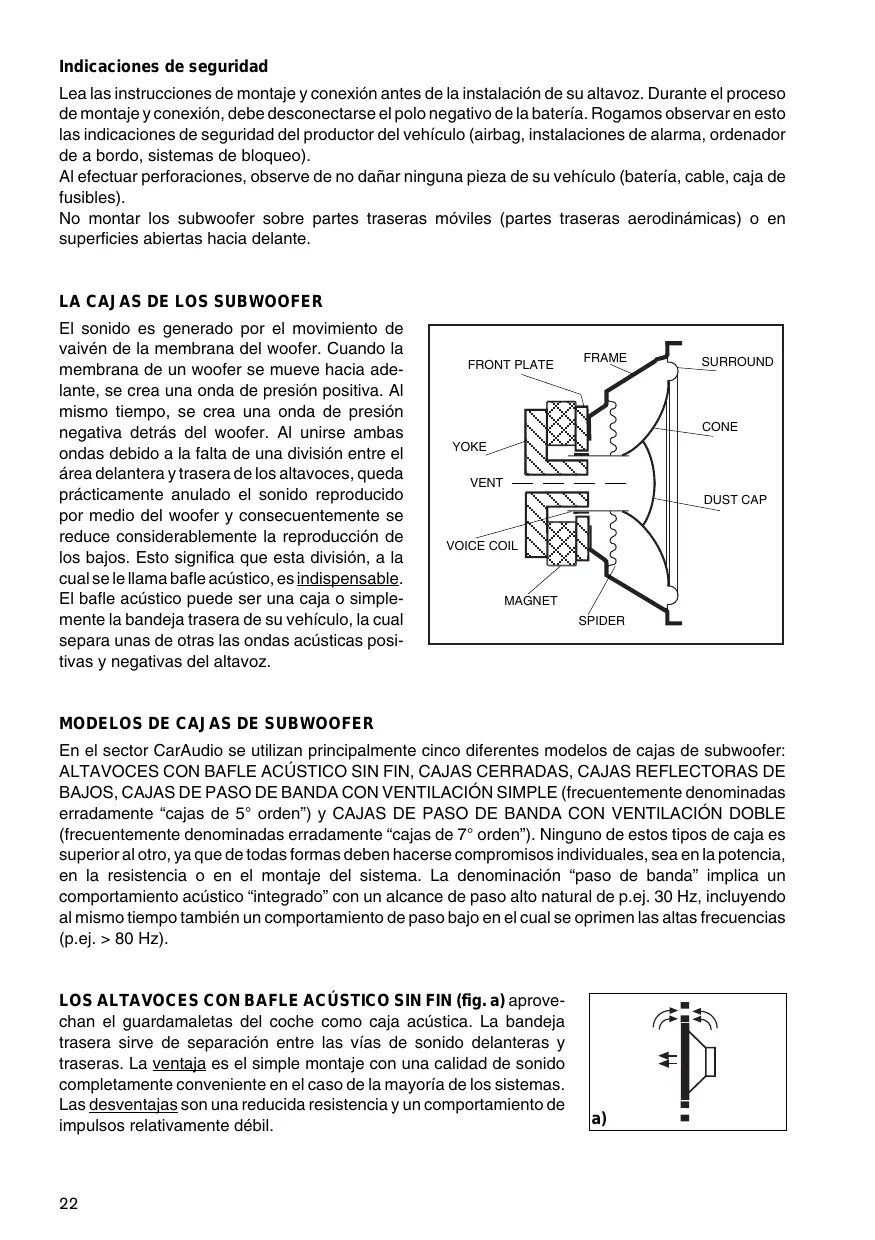 Lea las instrucciones de montaje y conexión antes de la instalación de su altavoz. Durante el proceso de montaje y conexión, debe desconectarse el polo negativo de la batería. Rogamos observar en esto las indicaciones de seguridad del productor del vehículo (airbag, instalaciones de alarma, ordenador de a bordo, sistemas de bloqueo). Al efectuar perforaciones, observe de no dañar ninguna pieza de su vehículo (batería, cable, caja de fusibles). No montar los subwoofer sobre partes traseras móviles (partes traseras aerodinámicas) o en superficies abiertas hacia delante.