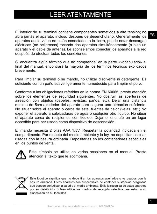 Servicio técnico: soporte@metronic.com · 902 09 01 36
