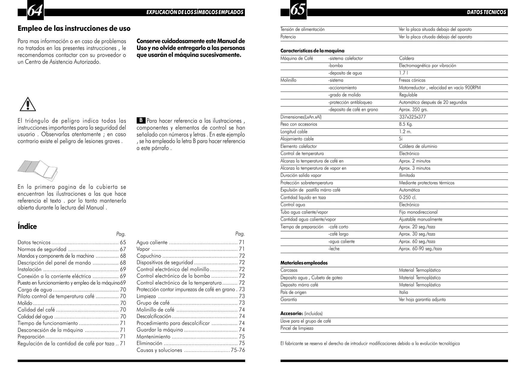 Normas de seguridad 67 Mandos y components de la machina 68 Descripción del panel de mando 68 Instalación 69 Conexión a la corriente eléctrica 69 Puesta en funcionamiento y empleo de la máquina69 Carga de agua 70 Piloto control de temperatura café 70 Molido 70 Calidad del café 70 Calidad del agua 70 Tiempo de funcionamiento 71 Desconecsión de la máquina 71 Preparación 71 Regulación de la cantidad de café por taza .. 71
