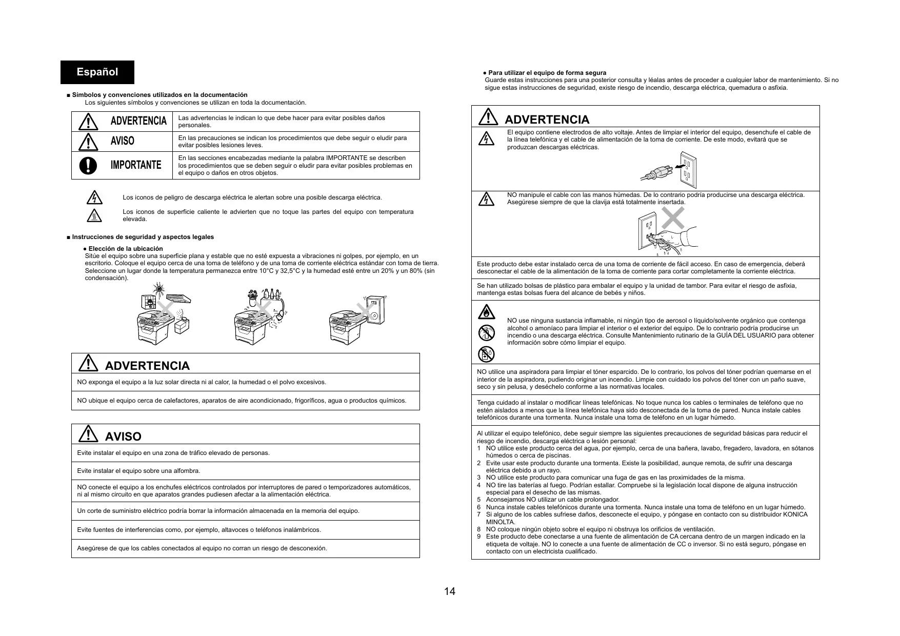 ● Para utilizar el equipo de forma segura Guarde estas instrucciones para una posterior consulta y léalas antes de proceder a cualquier labor de mantenimiento. Si no sigue estas instrucciones de seguridad, existe riesgo de incendio, descarga eléctrica, quemadura o asfixia. ■ Símbolos y convenciones utilizados en la documentación Los siguientes símbolos y convenciones se utilizan en toda la documentación. ADVERTENCIA Las advertencias le indican lo que debe hacer para evitar posibles daños personales. AVISO En las precauciones se indican los procedimientos que debe seguir o eludir para evitar posibles lesiones leves. IMPORTANTE En las secciones encabezadas mediante la palabra IMPORTANTE se describen los procedimientos que se deben seguir o eludir para evitar posibles problemas en el equipo o daños en otros objetos. ADVERTENCIA El equipo contiene electrodos de alto voltaje. Antes de limpiar el interior del equipo, desenchufe el cable de la línea telefónica y el cable de alimentación de la toma de corriente. De este modo, evitará que se produzcan descargas eléctricas. NO manipule el cable con las manos húmedas. De lo contrario podría producirse una descarga eléctrica. Asegúrese siempre de que la clavija está totalmente insertada. Los iconos de peligro de descarga eléctrica le alertan sobre una posible descarga eléctrica. Los iconos de superficie caliente le advierten que no toque las partes del equipo con temperatura elevada. ■ Instrucciones de seguridad y aspectos legales ● Elección de la ubicación Sitúe el equipo sobre una superficie plana y estable que no esté expuesta a vibraciones ni golpes, por ejemplo, en un escritorio. Coloque el equipo cerca de una toma de teléfono y de una toma de corriente eléctrica estándar con toma de tierra. Seleccione un lugar donde la temperatura permanezca entre 10°C y 32,5°C y la humedad esté entre un 20% y un 80% (sin condensación). Este producto debe estar instalado cerca de una toma de corriente de fácil acceso. En caso de emergencia, deberá desconectar el cable de la alimentación de la toma de corriente para cortar completamente la corriente eléctrica. Se han utilizado bolsas de plástico para embalar el equipo y la unidad de tambor. Para evitar el riesgo de asfixia, mantenga estas bolsas fuera del alcance de bebés y niños. NO use ninguna sustancia inflamable, ni ningún tipo de aerosol o líquido/solvente orgánico que contenga alcohol o amoníaco para limpiar el interior o el exterior del equipo. De lo contrario podría producirse un incendio o una descarga eléctrica. Consulte Mantenimiento rutinario de la GUÍA DEL USUARIO para obtener información sobre cómo limpiar el equipo. ADVERTENCIA NO utilice una aspiradora para limpiar el tóner esparcido. De lo contrario, los polvos del tóner podrían quemarse en el interior de la aspiradora, pudiendo originar un incendio. Limpie con cuidado los polvos del tóner con un paño suave, seco y sin pelusa, y deséchelo conforme a las normativas locales. NO exponga el equipo a la luz solar directa ni al calor, la humedad o el polvo excesivos. NO ubique el equipo cerca de calefactores, aparatos de aire acondicionado, frigoríficos, agua o productos químicos. Tenga cuidado al instalar o modificar líneas telefónicas. No toque nunca los cables o terminales de teléfono que no estén aislados a menos que la línea telefónica haya sido desconectada de la toma de pared. Nunca instale cables telefónicos durante una tormenta. Nunca instale una toma de teléfono en un lugar húmedo. Al utilizar el equipo telefónico, debe seguir siempre las siguientes precauciones de seguridad básicas para reducir el riesgo de incendio, descarga eléctrica o lesión personal: 1 NO utilice este producto cerca del agua, por ejemplo, cerca de una bañera, lavabo, fregadero, lavadora, en sótanos húmedos o cerca de piscinas. 2 Evite usar este producto durante una tormenta. Existe la posibilidad, aunque remota, de sufrir una descarga eléctrica debido a un rayo. 3 NO utilice este producto para comunicar una fuga de gas en las proximidades de la misma. 4 NO tire las baterías al fuego. Podrían estallar. Compruebe si la legislación local dispone de alguna instrucción especial para el desecho de las mismas. 5 Aconsejamos NO utilizar un cable prolongador. 6 Nunca instale cables telefónicos durante una tormenta. Nunca instale una toma de teléfono en un lugar húmedo. 7 Si alguno de los cables sufriese daños, desconecte el equipo, y póngase en contacto con su distribuidor KONICA MINOLTA. 8 NO coloque ningún objeto sobre el equipo ni obstruya los orificios de ventilación. 9 Este producto debe conectarse a una fuente de alimentación de CA cercana dentro de un margen indicado en la etiqueta de voltaje. NO lo conecte a una fuente de alimentación de CC o inversor. Si no está seguro, póngase en contacto con un electricista cualificado. AVISO Evite instalar el equipo en una zona de tráfico elevado de personas. Evite instalar el equipo sobre una alfombra. NO conecte el equipo a los enchufes eléctricos controlados por interruptores de pared o temporizadores automáticos, ni al mismo circuito en que aparatos grandes pudiesen afectar a la alimentación eléctrica. Un corte de suministro eléctrico podría borrar la información almacenada en la memoria del equipo. Evite fuentes de interferencias como, por ejemplo, altavoces o teléfonos inalámbricos. Asegúrese de que los cables conectados al equipo no corran un riesgo de desconexión.