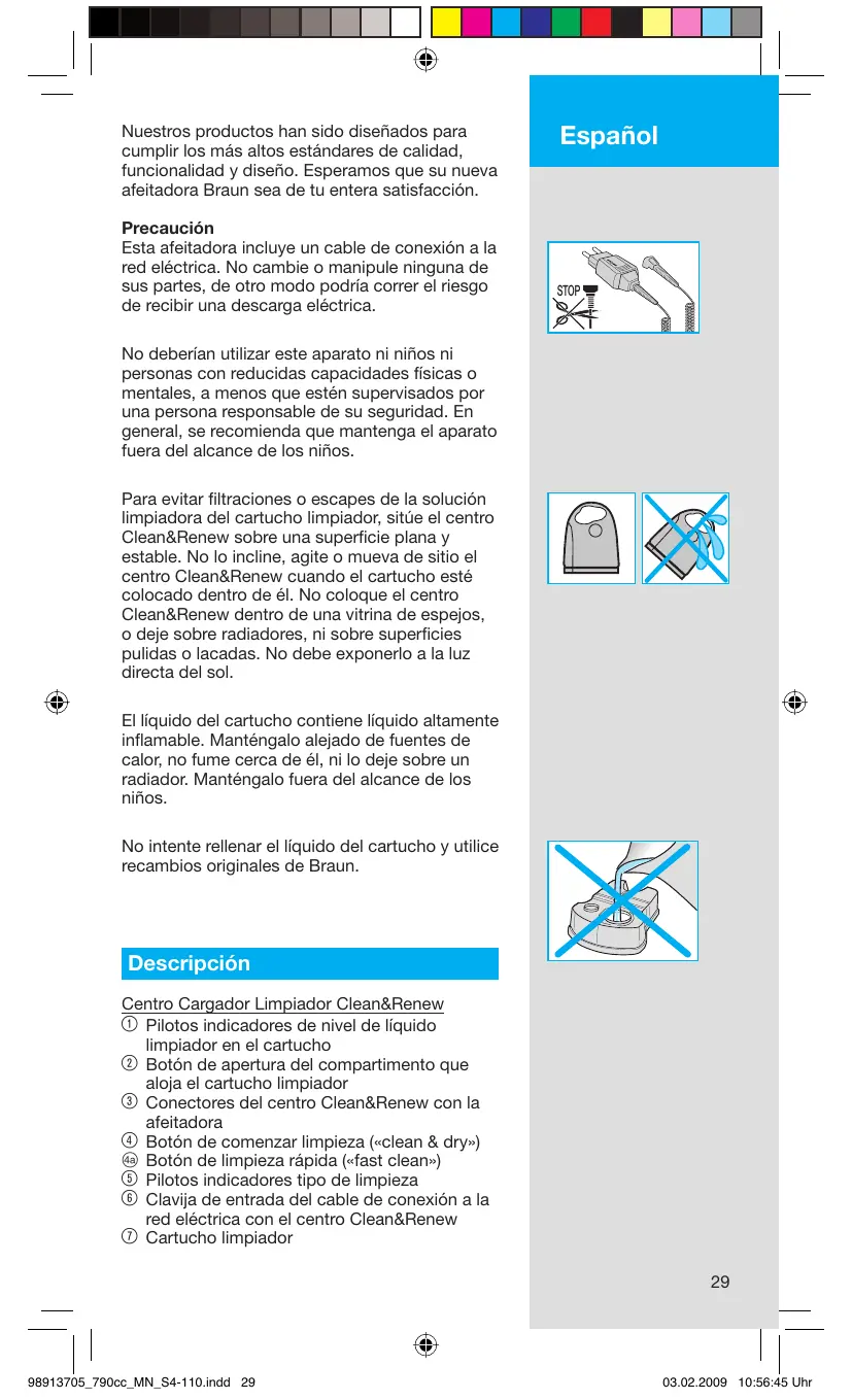 Nuestros productos han sido diseñados para cumplir los más altos estándares de calidad, funcionalidad y diseño. Esperamos que su nueva afeitadora Braun sea de tu entera satisfacción. Precaución Esta afeitadora incluye un cable de conexión a la red eléctrica. No cambie o manipule ninguna de sus partes, de otro modo podría correr el riesgo de recibir una descarga eléctrica. Español STOP No deberían utilizar este aparato ni niños ni personas con reducidas capacidades físicas o mentales, a menos que estén supervisados por una persona responsable de su seguridad. En general, se recomienda que mantenga el aparato fuera del alcance de los niños. Para evitar filtraciones o escapes de la solución limpiadora del cartucho limpiador, sitúe el centro Clean&Renew sobre una superficie plana y estable. No lo incline, agite o mueva de sitio el centro Clean&Renew cuando el cartucho esté colocado dentro de él. No coloque el centro Clean&Renew dentro de una vitrina de espejos, o deje sobre radiadores, ni sobre superficies pulidas o lacadas. No debe exponerlo a la luz directa del sol. El líquido del cartucho contiene líquido altamente inflamable. Manténgalo alejado de fuentes de calor, no fume cerca de él, ni lo deje sobre un radiador. Manténgalo fuera del alcance de los niños. No intente rellenar el líquido del cartucho y utilice recambios originales de Braun. Descripción Centro Cargador Limpiador Clean&Renew 1 Pilotos indicadores de nivel de líquido limpiador en el cartucho 2 Botón de apertura del compartimento que aloja el cartucho limpiador 3 Conectores del centro Clean&Renew con la afeitadora 4 Botón de comenzar limpieza («clean & dry») D Botón de limpieza rápida («fast clean») 5 Pilotos indicadores tipo de limpieza 6 Clavija de entrada del cable de conexión a la red eléctrica con el centro Clean&Renew 7 Cartucho limpiador