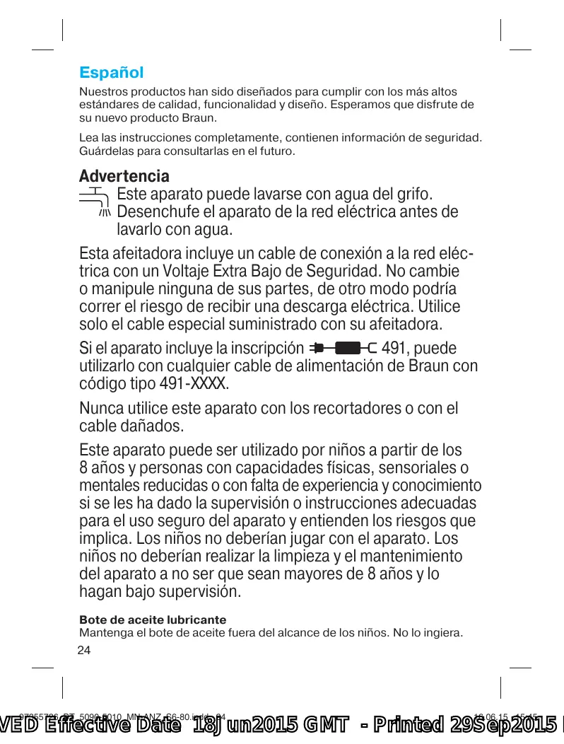 Español Nuestros productos han sido diseñados para cumplir con los más altos estándares de calidad, funcionalidad y diseño. Esperamos que disfrute de su nuevo producto Braun. Lea las instrucciones completamente, contienen información de seguridad. Guárdelas para consultarlas en el futuro. Advertencia Este aparato puede lavarse con agua del grifo. Desenchufe el aparato de la red eléctrica antes de lavarlo con agua. Esta afeitadora incluye un cable de conexión a la red eléctrica con un Voltaje Extra Bajo de Seguridad. No cambie o manipule ninguna de sus partes, de otro modo podría correr el riesgo de recibir una descarga eléctrica. Utilice solo el cable especial suministrado con su afeitadora. Si el aparato incluye la inscripción 491, puede utilizarlo con cualquier cable de alimentación de Braun con código tipo 491-XXXX. Nunca utilice este aparato con los recortadores o con el cable dañados. Este aparato puede ser utilizado por niños a partir de los 8 años y personas con capacidades físicas, sensoriales o mentales reducidas o con falta de experiencia y conocimiento si se les ha dado la supervisión o instrucciones adecuadas para el uso seguro del aparato y entienden los riesgos que implica. Los niños no deberían jugar con el aparato. Los niños no deberían realizar la limpieza y el mantenimiento del aparato a no ser que sean mayores de 8 años y lo hagan bajo supervisión. Bote de aceite lubricante Mantenga el bote de aceite fuera del alcance de los niños. No lo ingiera.