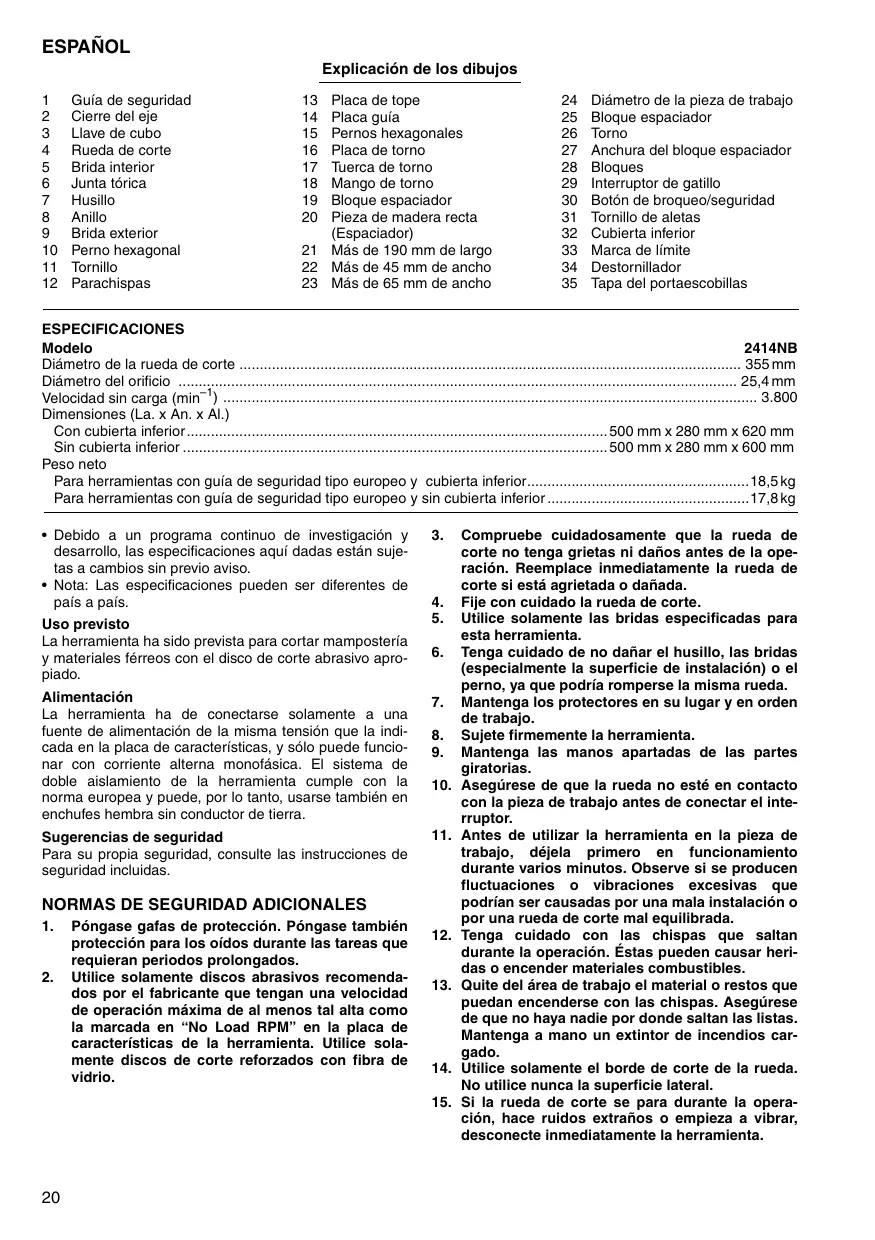 1. Péngase gafas de proteccién. Péngase también proteccién para los oidos durante las tareas que requieran periodos prolongados. Utilice solamente discos abrasivos recomenda- dos por el fabricante que tengan una velocidad de operacién mäxima de al menos tal alta como la marcada en “No Load RPM” en la placa de caracteristicas de la herramienta. Utilice sola- mente discos de corte reforzados con fibra de vidrio.