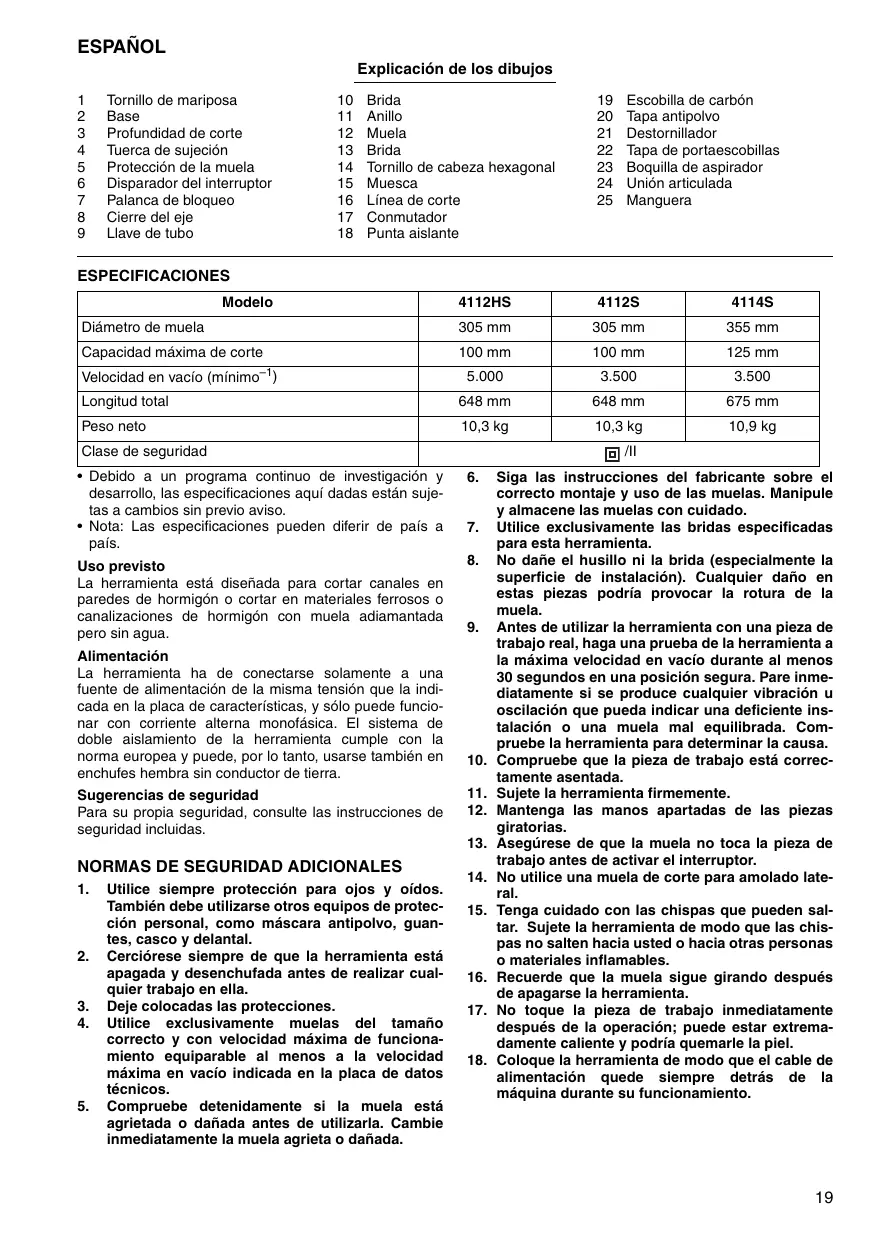 1 Tornillo de mariposa 10 Brida 19 Escobilla de carbôn 2 Base 11 Anillo 20 Tapa antipoo 3 Profundidad de corte 12 Muela 21 Destornillador 4 Tuerca de sujeciôn 13 Brida 22. Tapa de portaescobillas 5 Protecciôn de la muela 14 Tornillo de cabeza hexagonal 23 Boquilla de aspirador 6 Disparador del interruptor 15 Muesca 24. Uniôn articulada 7 Palanca de bloqueo 16 Linea de corte 25 Manguera 8 Cierre del eje 17. Conmutador 9 Llave de tubo 18 Punta aislante ESPECIFICACIONES Modelo Aa112HS 4112S 41145 Diämetro de muela 305 mm 305 mm 355 mm Capacidad mäxima de corte 100 mm 100 mm 125 mm Velocidad en vacio (minimo”?) 5.000 3.500 3.500 Longitud total 648 mm 648 mm 675 mm Peso nelo 10,3kg 10,3 Kg 10,9 kg Clase de seguridad El + Debido a un programa continuo de investigaciôn y 6. Siga las instrucciones del fabricante sobre el desarrollo, las especificaciones aqui dadas estän suje- correcto montaje y uso de las muelas. Manipule tas a cambios sin previo aviso. y almacene las muelas con cuidado. + Nota: Las especificaciones pueden diferir de pais a 7. Utilice exclusivamente las bridas especificadas pais. para esta herramienta. Uso previsto 8. No dañe el husillo ni la brida (especialmente la La herramienta esté diseñada para cortar canales en superficie de instalacién). Cualquier daño en paredes de hormigén o cortar en materiales ferrosos o estas piezas podria provocar la rotura de la canalizaciones de hormigén con muela adiamantada mule ï ï pero sin ague. 9. Antes de utilizar la herramienta con una pieza de k " trabajo real, haga una prueba de la herramienta a Alimentaciôn la méxima velocidad en vacio durante al menos La herramienta ha de conectarse solamente a una 30 segundos en una posiclén segura. Pare inme- fuente de alimentacién de la misma tensiôn que la indi- iatamente si se produce cualquier vibracién u cada en la placa de caracteristicas, y sélo puede funcio- oscllaclén que pueda Indicar una deficiente ins- nar con corriente alterna monofésica. El sistema de talaclén o una muela mal equillbrada. Com- doble aislamiento de la herramienta cumple con la pruebe la herramienta para determinar la causa. norma europea y puede, por lo tanto, usarse también en 10. Compruebe que la pieza de trabajo est correc- enchufes hembra sin conductor de tierra. tamente asentada. Sugerencias de seguridad 11. Sujete la herramienta firmemente. Para su propia seguridad, consulte las instrucciones de 12. Mantenga las manos apartadas de las piezas seguridad incluidas. giratorias. 13. Asegürese de que la muela no toca la pieza de NORMAS DE SEGURIDAD ADICIONALES trabajo antes de activar el interruptor. et _. . ; 14. No utilice una muela de corte para amolado late- 1. Utilice siempre proteccién para ojos y oidos. ral. También debe utilizarse otros equipos de protec- 15. Tenga cuidado con las chispas que pueden sal- cién personal, como mäscara antipolvo, guan- tar. Sujete la herramienta de modo que las chis- tes, casco y delantal. . h pas no salten hacia usted o hacia otras personas 2. Cerciérese siempre de que la herramienta esté © materiales inflamables. apagada y desenchufada antes de realizar cual- 16. Recuerde que la muela sigue girando después quier trabajo en ella. l de apagarse la herramienta. 3. Deje colocadas las protecciones. 17. No toque la pieza de trabajo inmediatamente 4. Utilice exclusivamente muelas del tamaño después de la operacién: puede estar extrema- correcto y con velocidad méxima de funciona- damente caliente y podria quemarle la piel miento equiparable al menos a la velocidad 18. Coloque la herramienta de modo que el cable de