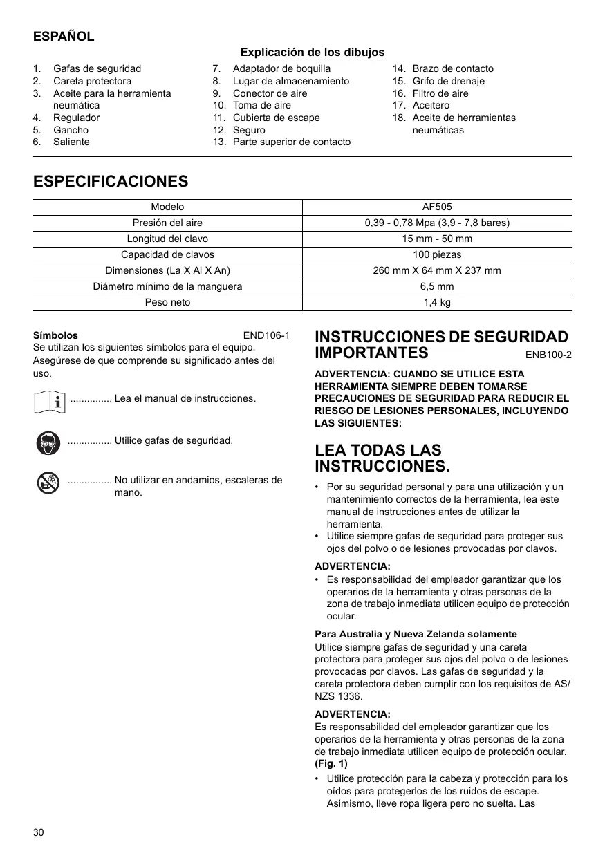 - Utilice solamente los clavos asignados en este manual. La realizacion de others clavos puede occasionar un mal configuracion de la herramienta.