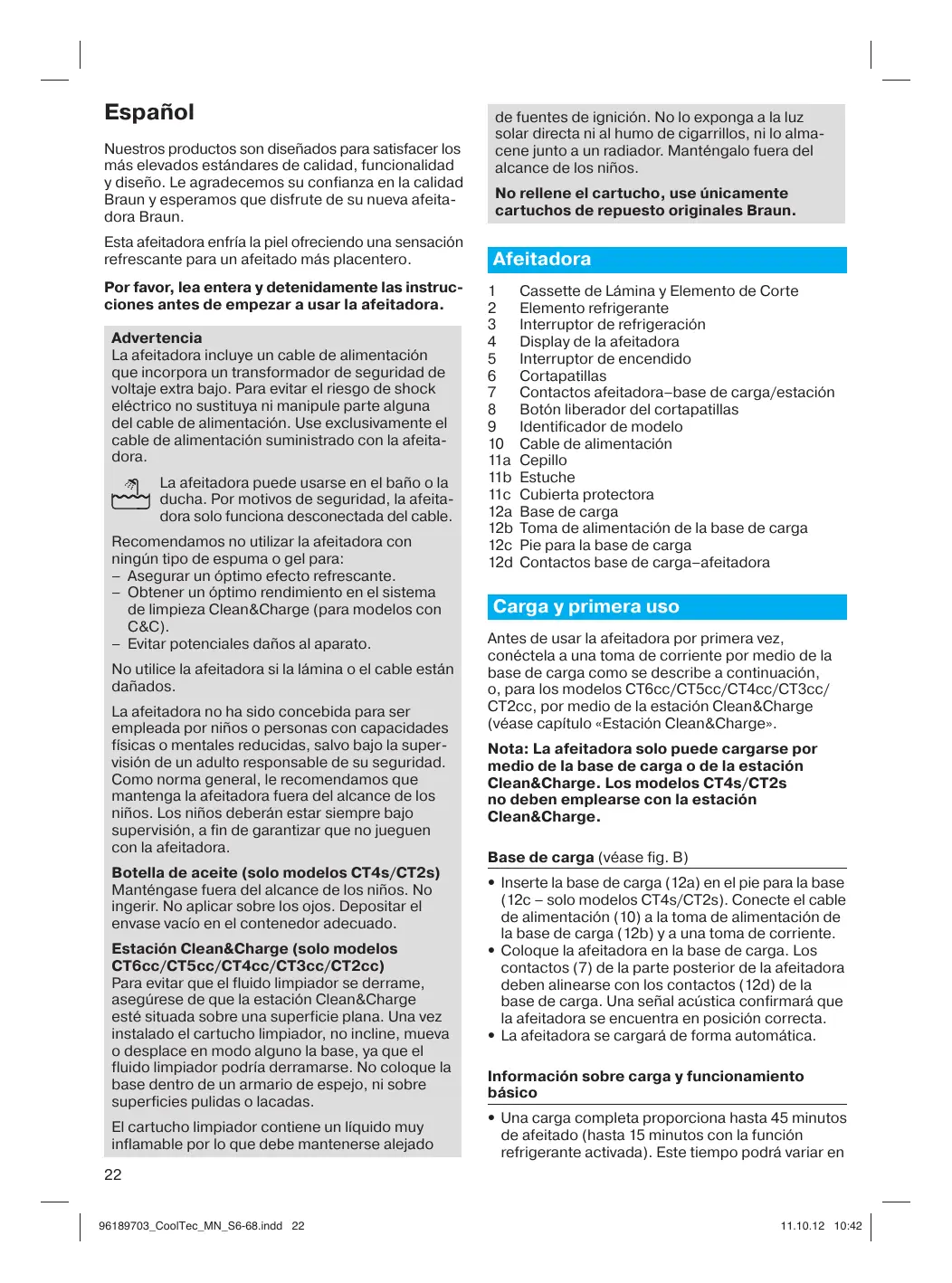 Español Nuestros productos son diseñados para satisfacer los más elevados estándares de calidad, funcionalidad y diseño. Le agradecemos su confianza en la calidad Braun y esperamos que disfrute de su nueva afeitadora Braun. Esta afeitadora enfría la piel ofreciendo una sensación refrescante para un afeitado más placentero. Por favor, lea entera y detenidamente las instrucciones antes de empezar a usar la afeitadora. Advertencia La afeitadora incluye un cable de alimentación que incorpora un transformador de seguridad de voltaje extra bajo. Para evitar el riesgo de shock eléctrico no sustituya ni manipule parte alguna del cable de alimentación. Use exclusivamente el cable de alimentación suministrado con la afeitadora. La afeitadora puede usarse en el baño o la ducha. Por motivos de seguridad, la afeitadora solo funciona desconectada del cable. Recomendamos no utilizar la afeitadora con ningún tipo de espuma o gel para: – Asegurar un óptimo efecto refrescante. – Obtener un óptimo rendimiento en el sistema de limpieza Clean&Charge (para modelos con C&C). – Evitar potenciales daños al aparato. No utilice la afeitadora si la lámina o el cable están dañados. La afeitadora no ha sido concebida para ser empleada por niños o personas con capacidades físicas o mentales reducidas, salvo bajo la supervisión de un adulto responsable de su seguridad. Como norma general, le recomendamos que mantenga la afeitadora fuera del alcance de los niños. Los niños deberán estar siempre bajo supervisión, a fin de garantizar que no jueguen con la afeitadora. Botella de aceite (solo modelos CT4s/CT2s) Manténgase fuera del alcance de los niños. No ingerir. No aplicar sobre los ojos. Depositar el envase vacío en el contenedor adecuado. Estación Clean&Charge (solo modelos CT6cc/CT5cc/CT4cc/CT3cc/CT2cc) Para evitar que el fluido limpiador se derrame, asegúrese de que la estación Clean&Charge esté situada sobre una superficie plana. Una vez instalado el cartucho limpiador, no incline, mueva o desplace en modo alguno la base, ya que el fluido limpiador podría derramarse. No coloque la base dentro de un armario de espejo, ni sobre superficies pulidas o lacadas. El cartucho limpiador contiene un líquido muy inflamable por lo que debe mantenerse alejado de fuentes de ignición. No lo exponga a la luz solar directa ni al humo de cigarrillos, ni lo almacene junto a un radiador. Manténgalo fuera del alcance de los niños. No rellene el cartucho, use únicamente cartuchos de repuesto originales Braun. Cassette de Lámina y Elemento de Corte Elemento refrigerante Interruptor de refrigeración Display de la afeitadora Interruptor de encendido Cortapatillas Contactos afeitadora–base de carga/estación Botón liberador del cortapatillas Identificador de modelo Cable de alimentación Cepillo Estuche Cubierta protectora Base de carga Toma de alimentación de la base de carga Pie para la base de carga Contactos base de carga–afeitadora Carga y primera uso Antes de usar la afeitadora por primera vez, conéctela a una toma de corriente por medio de la base de carga como se describe a continuación, o, para los modelos CT6cc/CT5cc/CT4cc/CT3cc/ CT2cc, por medio de la estación Clean&Charge (véase capítulo «Estación Clean&Charge». Nota: La afeitadora solo puede cargarse por medio de la base de carga o de la estación Clean&Charge. Los modelos CT4s/CT2s no deben emplearse con la estación Clean&Charge. Base de carga (véase fig. B)