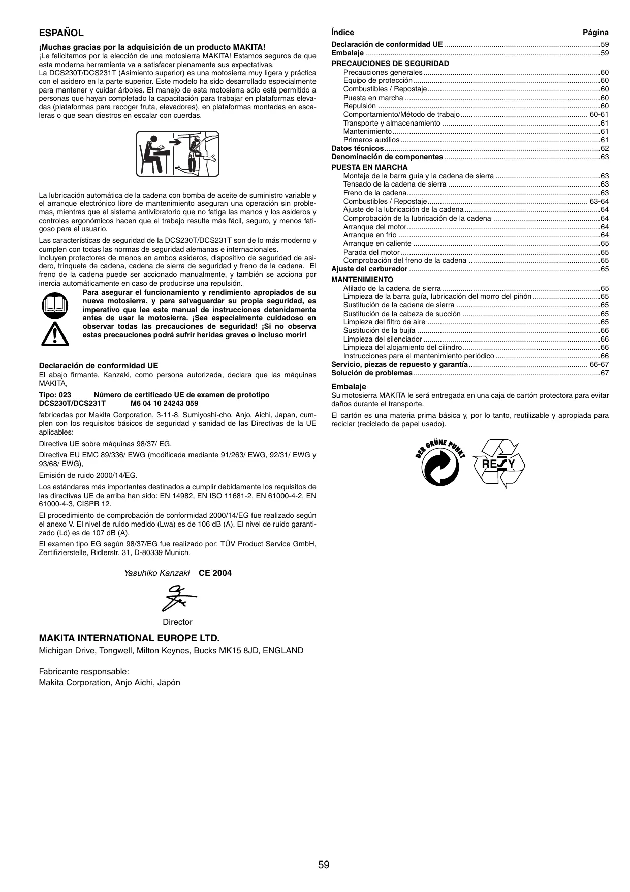 Los nu de kettingrem. Warm starten ¡Muchas gracias por la adquisición de un producto MAKITA! ¡Le felicitamos por la elección de una motosierra MAKITA! Estamos seguros de que esta moderna herramienta va a satisfacer plenamente sus expectativas. La DCS230T/DCS231T (Asimiento superior) es una motosierra muy ligera y práctica con el asidero en la parte superior. Este modelo ha sido desarrollado especialmente para mantener y cuidar árboles. El manejo de esta motosierra sólo está permitido a personas que hayan completado la capacitación para trabajar en plataformas elevadas (plataformas para recoger fruta, elevadores), en plataformas montadas en escaleras o que sean diestros en escalar con cuerdas. La lubricación automática de la cadena con bomba de aceite de suministro variable y el arranque electrónico libre de mantenimiento aseguran una operación sin problemas, mientras que el sistema antivibratorio que no fatiga las manos y los asideros y controles ergonómicos hacen que el trabajo resulte más fácil, seguro, y menos fatigoso para el usuario. Las características de seguridad de la DCS230T/DCS231T son de lo más moderno y cumplen con todas las normas de seguridad alemanas e internacionales. Incluyen protectores de manos en ambos asideros, dispositivo de seguridad de asidero, trinquete de cadena, cadena de sierra de seguridad y freno de la cadena. El freno de la cadena puede ser accionado manualmente, y también se acciona por inercia automáticamente en caso de producirse una repulsión. Para asegurar el funcionamiento y rendimiento apropiados de su nueva motosierra, y para salvaguardar su propia seguridad, es imperativo que lea este manual de instrucciones detenidamente antes de usar la motosierra. ¡Sea especialmente cuidadoso en observar todas las precauciones de seguridad! ¡Si no observa estas precauciones podrá sufrir heridas graves o incluso morir! Declaración de conformidad UE El abajo firmante, Kanzaki, como persona autorizada, declara que las máquinas MAKITA, Página Embalaje Tipo: 023 Número de certificado UE de examen de prototipo