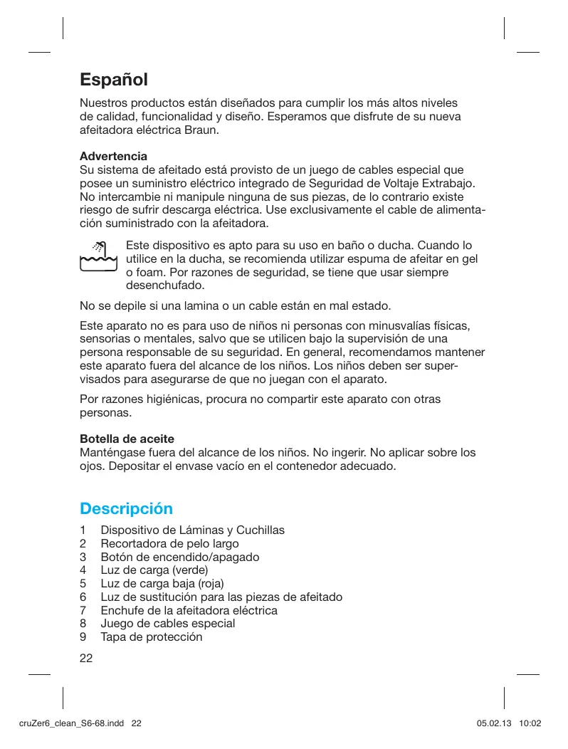 Español Nuestros productos están diseñados para cumplir los más altos niveles de calidad, funcionalidad y diseño. Esperamos que disfrute de su nueva afeitadora eléctrica Braun. Advertencia Su sistema de afeitado está provisto de un juego de cables especial que posee un suministro eléctrico integrado de Seguridad de Voltaje Extrabajo. No intercambie ni manipule ninguna de sus piezas, de lo contrario existe riesgo de sufrir descarga eléctrica. Use exclusivamente el cable de alimentación suministrado con la afeitadora. Este dispositivo es apto para su uso en baño o ducha. Cuando lo utilice en la ducha, se recomienda utilizar espuma de afeitar en gel o foam. Por razones de seguridad, se tiene que usar siempre desenchufado. No se depile si una lamina o un cable están en mal estado. Este aparato no es para uso de niños ni personas con minusvalías físicas, sensorias o mentales, salvo que se utilicen bajo la supervisión de una persona responsable de su seguridad. En general, recomendamos mantener este aparato fuera del alcance de los niños. Los niños deben ser supervisados para asegurarse de que no juegan con el aparato. Por razones higiénicas, procura no compartir este aparato con otras personas. Botella de aceite Manténgase fuera del alcance de los niños. No ingerir. No aplicar sobre los ojos. Depositar el envase vacío en el contenedor adecuado. Descripción
