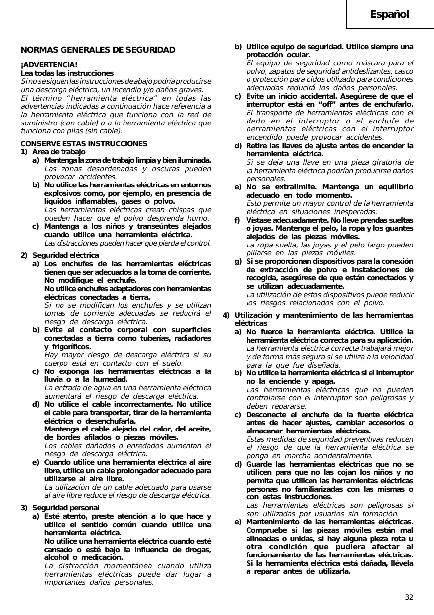 Español Se producen muchos accidentes por no realizar un mantenimiento correcto de las herramientas eléctricas. f) Mantenga las herramientas de corte afiladas y limpias. Las herramientas de corte correctamente mantenidas con los bordes de corte afilados son más fáciles de controlar. g) Utilice la herramienta eléctrica, los accesorios y las brocas de la herramienta, etc., de acuerdo con estas instrucciones y de la manera adecuada para el tipo de herramienta eléctrica, teniendo en cuenta las condiciones laborales y el trabajo que se va a realizar. La utilización de la herramienta eléctrica para operaciones diferentes a pretendidas podría dar lugar a una situación peligrosa.