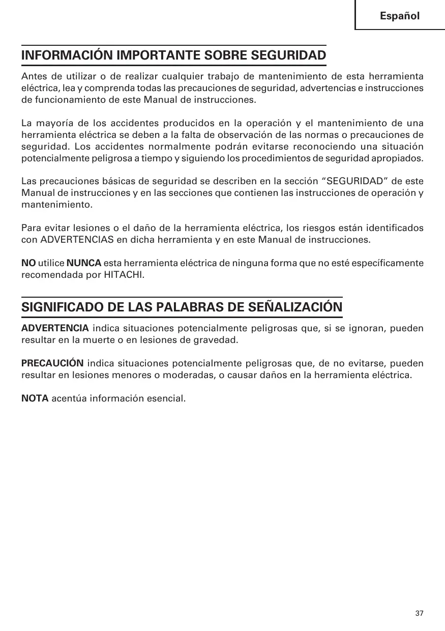NO utilise NUNCA esta herramipta électrique deyinguna forma que no este especificamente recomendada por HITACHI.