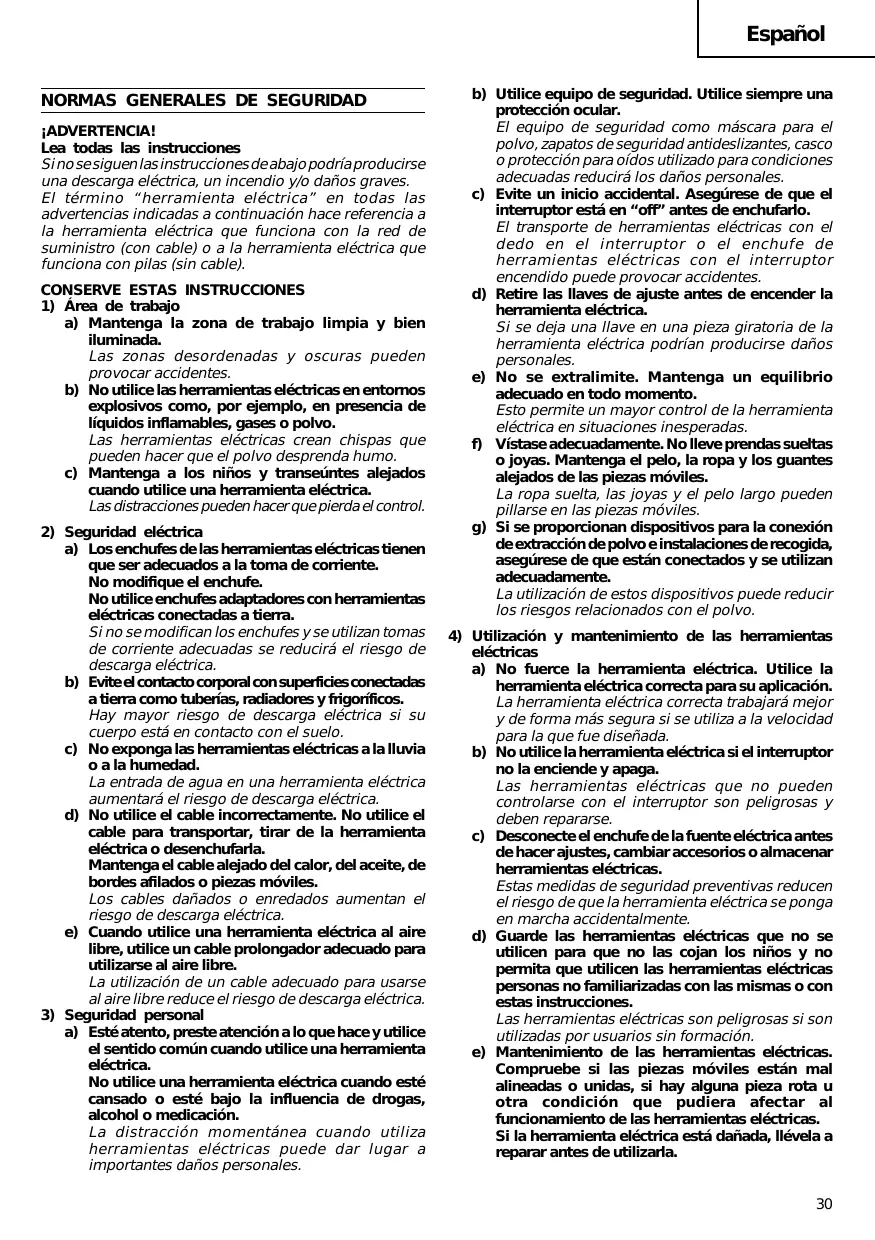 Español Se producen muchos accidentes por no realizar un mantenimiento correcto de las herramientas eléctricas. f) Mantenga las herramientas de corte afiladas y limpias. Las herramientas de corte correctamente mantenidas con los bordes de corte afilados son más fáciles de controlar. g) Utilice la herramienta eléctrica, los accesorios y las brocas de la herramienta, etc., de acuerdo con estas instrucciones y de la manera adecuada para el tipo de herramienta eléctrica, teniendo en cuenta las condiciones laborales y el trabajo que se va a realizar. La utilización de la herramienta eléctrica para operaciones diferentes a pretendidas podría dar lugar a una situación peligrosa.