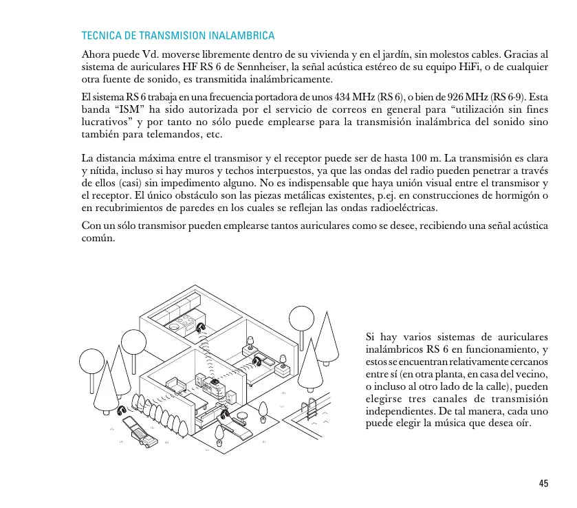 Ahora puede Vd. moverse libremente dentro de su vivienda y en el jardín, sin molestos cables. Gracias al sistema de auriculares HF RS 6 de Sennheiser, la señal acústica estéreo de su equipo HiFi, o de cualquier otra fuente de sonido, es transmitida inalámbricamente. El sistema RS 6 trabaja en una frecuencia portadora de unos 434 MHz (RS 6), o bien de 926 MHz (RS 6-9). Esta banda “ISM” ha sido autorizada por el servicio de correos en general para “utilización sin fines lucrativos” y por tanto no sólo puede emplearse para la transmisión inalámbrica del sonido sino también para telemandos, etc. La distancia máxima entre el transmisor y el receptor puede ser de hasta 100 m. La transmisión es clara y nítida, incluso si hay muros y techos interpuestos, ya que las ondas del radio pueden penetrar a través de ellos (casi) sin impedimento alguno. No es indispensable que haya unión visual entre el transmisor y el receptor. El único obstáculo son las piezas metálicas existentes, p.ej. en construcciones de hormigón o en recubrimientos de paredes en los cuales se reflejan las ondas radioeléctricas. Con un sólo transmisor pueden emplearse tantos auriculares como se desee, recibiendo una señal acústica común. Si hay varios sistemas de auriculares inalámbricos RS 6 en funcionamiento, y estos se encuentran relativamente cercanos entre sí (en otra planta, en casa del vecino, o incluso al otro lado de la calle), pueden elegirse tres canales de transmisión independientes. De tal manera, cada uno puede elegir la música que desea oír.