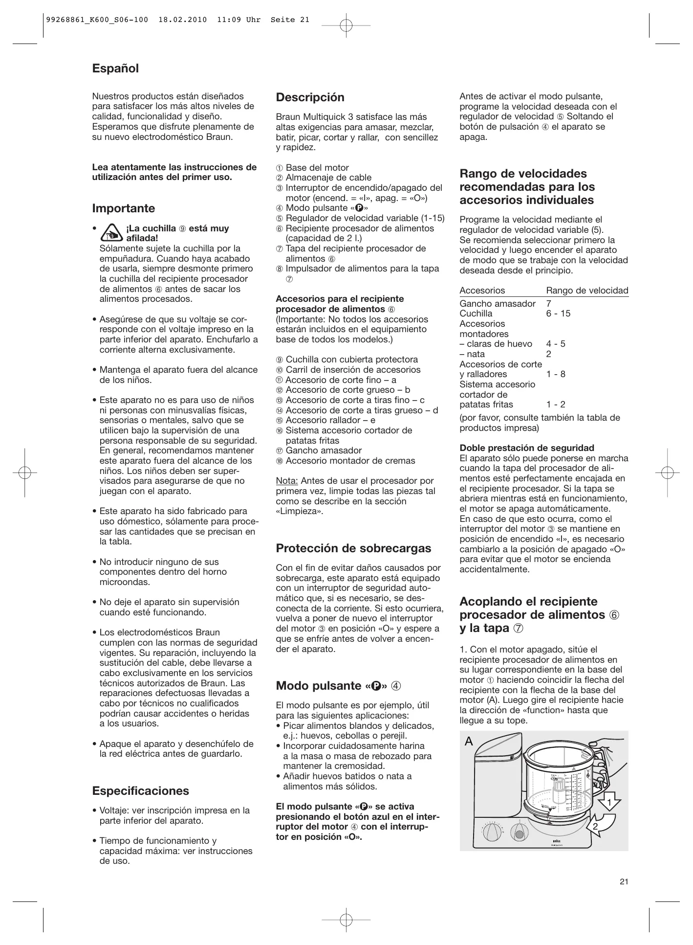 Español Nuestros productos están diseñados para satisfacer los más altos niveles de calidad, funcionalidad y diseño. Esperamos que disfrute plenamente de su nuevo electrodoméstico Braun. Descripción Lea atentamente las instrucciones de utilización antes del primer uso. 1 Base del motor 2 Almacenaje de cable 3 Interruptor de encendido/apagado del motor (encend. = «I», apag. = «O») 4 Modo pulsante «» 5 Regulador de velocidad variable (1-15) 6 Recipiente procesador de alimentos (capacidad de 2 l.) 7 Tapa del recipiente procesador de alimentos 6 8 Impulsador de alimentos para la tapa