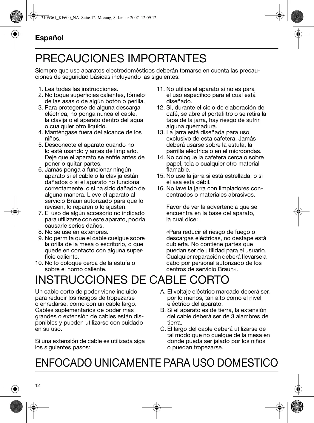 Un cable corto de poder viene incluido para reducir los riesgos de tropezarse o enredarse, como con un cable largo. Cables suplementarios de poder más grandes o extensión de cables están disponibles y pueden utilizarse con cuidado en su uso. Si una extensión de cable es utilizada siga los siguientes pasos: A. El voltaje eléctrico marcado deberá ser, por lo menos, tan alto como el nivel eléctrico del aparato. B. Si el aparato es de tierra, la extensión del cable deberá ser de 3 alambres de tierra. C. El largo del cable deberá utilizarse de tal modo que no cuelgue de la mesa en donde pueda ser jalado por los niños o puedan tropezarse. Nuestros productos están fabricados para ofrecer los más altos estándares de calidad, funcionalidad y diseño. Esperamos que usted disfrute su nuevo electrodoméstico Braun. Precaución