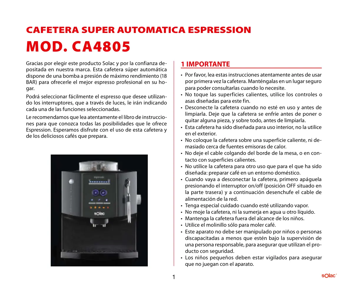 MOD. CA4805 Gracias por elegir este producto Solac y por la confianza depositada en nuestra marca. Esta cafetera súper automática dispone de una bomba a presión de máximo rendimiento (18 BAR) para ofrecerle el mejor espresso profesional en su hogar. Podrá seleccionar fácilmente el espresso que desee utilizando los interruptores, que a través de luces, le irán indicando cada una de las funciones seleccionadas. Le recomendamos que lea atentamente el libro de instrucciones para que conozca todas las posibilidades que le ofrece Espression. Esperamos disfrute con el uso de esta cafetera y de los deliciosos cafés que prepara. 1 IMPORTANTE