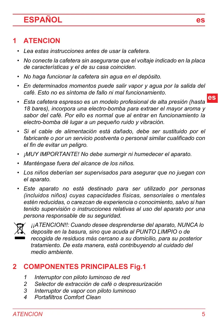 ¡¡ATENCION!!: Cuando desee desprenderse del aparato, NUNCA lo deposite en la basura, sino que acuda al PUNTO LIMPIO o de recogida de residuos más cercano a su domicilio, para su posterior tratamiento. De esta manera, está contribuyendo al cuidado del medio ambiente. Interruptor con piloto luminoso de red Selector de extracción de café o despresurización Interruptor de vapor con piloto luminoso Portafiltros Comfort Clean ATENCION