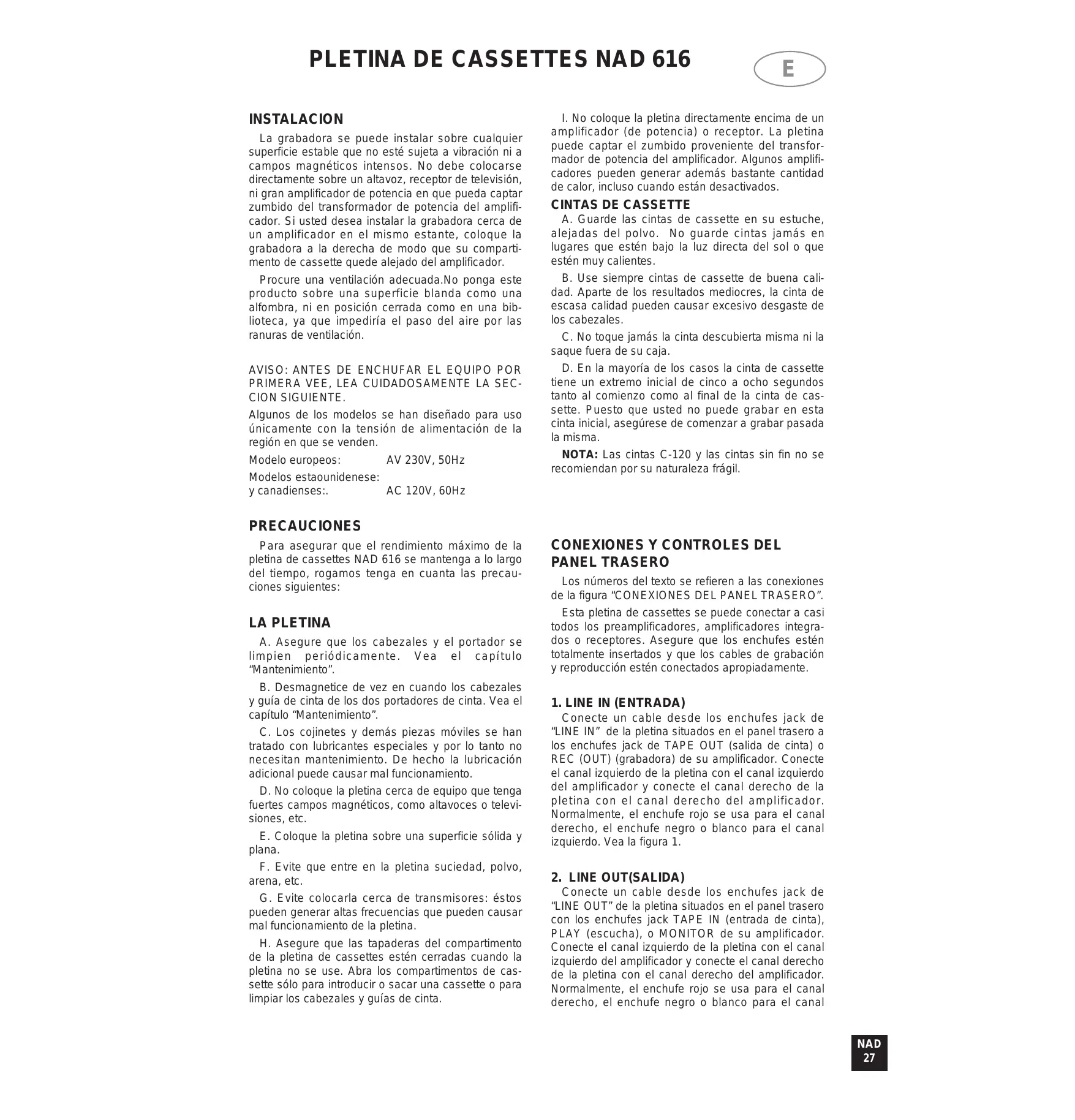 A. Guarde las cintas de cassette en su estuche, alejadas del polvo. No guarde cintas jamás en lugares que estén bajo la luz directa del sol o que estén muy calientes. Procure una ventilación adecuada.No ponga este producto sobre una superficie blanda como una alfombra, ni en posición cerrada como en una biblioteca, ya que impediría el paso del aire por las ranuras de ventilación. B. Use siempre cintas de cassette de buena calidad. Aparte de los resultados mediocres, la cinta de escasa calidad pueden causar excesivo desgaste de los cabezales. AVISO: ANTES DE ENCHUFAR EL EQUIPO POR PRIMERA VEE, LEA CUIDADOSAMENTE LA SECCION SIGUIENTE. D. En la mayoría de los casos la cinta de cassette tiene un extremo inicial de cinco a ocho segundos tanto al comienzo como al final de la cinta de cassette. Puesto que usted no puede grabar en esta cinta inicial, asegúrese de comenzar a grabar pasada la misma. Algunos de los modelos se han diseñado para uso únicamente con la tensión de alimentación de la región en que se venden. Modelo europeos: AV 230V, 50Hz Modelos estaounidenese: y canadienses:. AC 120V, 60Hz C. No toque jamás la cinta descubierta misma ni la saque fuera de su caja. NOTA: Las cintas C-120 y las cintas sin fin no se recomiendan por su naturaleza frágil. PRECAUCIONES Para asegurar que el rendimiento máximo de la pletina de cassettes NAD 616 se mantenga a lo largo del tiempo, rogamos tenga en cuanta las precauciones siguientes: LA PLETINA A. Asegure que los cabezales y el portador se limpien periódicamente. Vea el capítulo “Mantenimiento”. B. Desmagnetice de vez en cuando los cabezales y guía de cinta de los dos portadores de cinta. Vea el capítulo “Mantenimiento”. C. Los cojinetes y demás piezas móviles se han tratado con lubricantes especiales y por lo tanto no necesitan mantenimiento. De hecho la lubricación adicional puede causar mal funcionamiento. D. No coloque la pletina cerca de equipo que tenga fuertes campos magnéticos, como altavoces o televisiones, etc. E. Coloque la pletina sobre una superficie sólida y plana. F. Evite que entre en la pletina suciedad, polvo, arena, etc. G. Evite colocarla cerca de transmisores: éstos pueden generar altas frecuencias que pueden causar mal funcionamiento de la pletina. H. Asegure que las tapaderas del compartimento de la pletina de cassettes estén cerradas cuando la pletina no se use. Abra los compartimentos de cassette sólo para introducir o sacar una cassette o para limpiar los cabezales y guías de cinta.