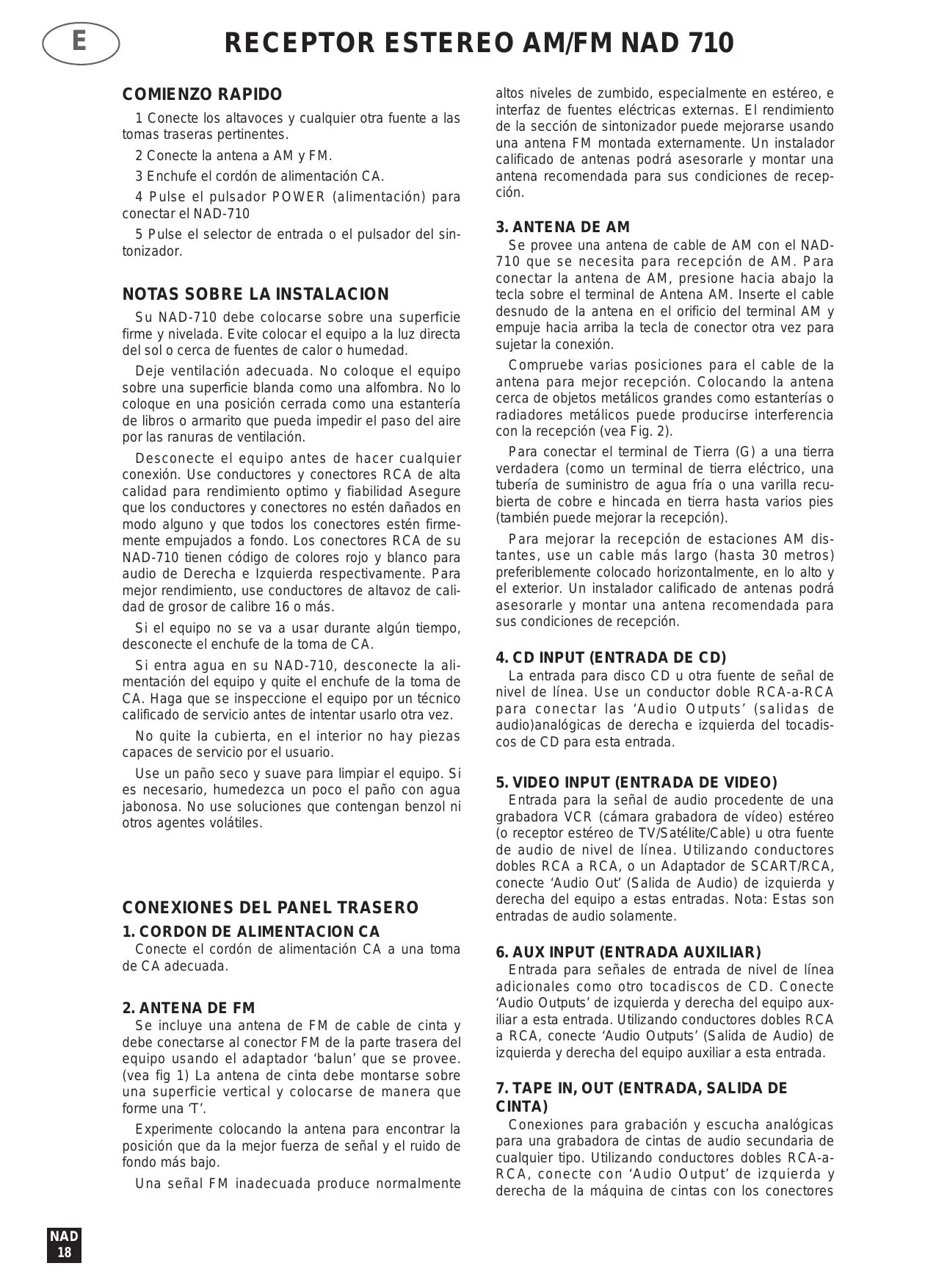 COMIENZO RAPIDO 1 Conecte los altavoces y cualquier otra fuente a las tomas traseras pertinentes. 2 Conecte la antena a AM y FM. 3 Enchufe el cordón de alimentación CA. 4 Pulse el pulsador POWER (alimentación) para conectar el NAD-710 5 Pulse el selector de entrada o el pulsador del sintonizador. altos niveles de zumbido, especialmente en estéreo, e interfaz de fuentes eléctricas externas. El rendimiento de la sección de sintonizador puede mejorarse usando una antena FM montada externamente. Un instalador calificado de antenas podrá asesorarle y montar una antena recomendada para sus condiciones de recepción.