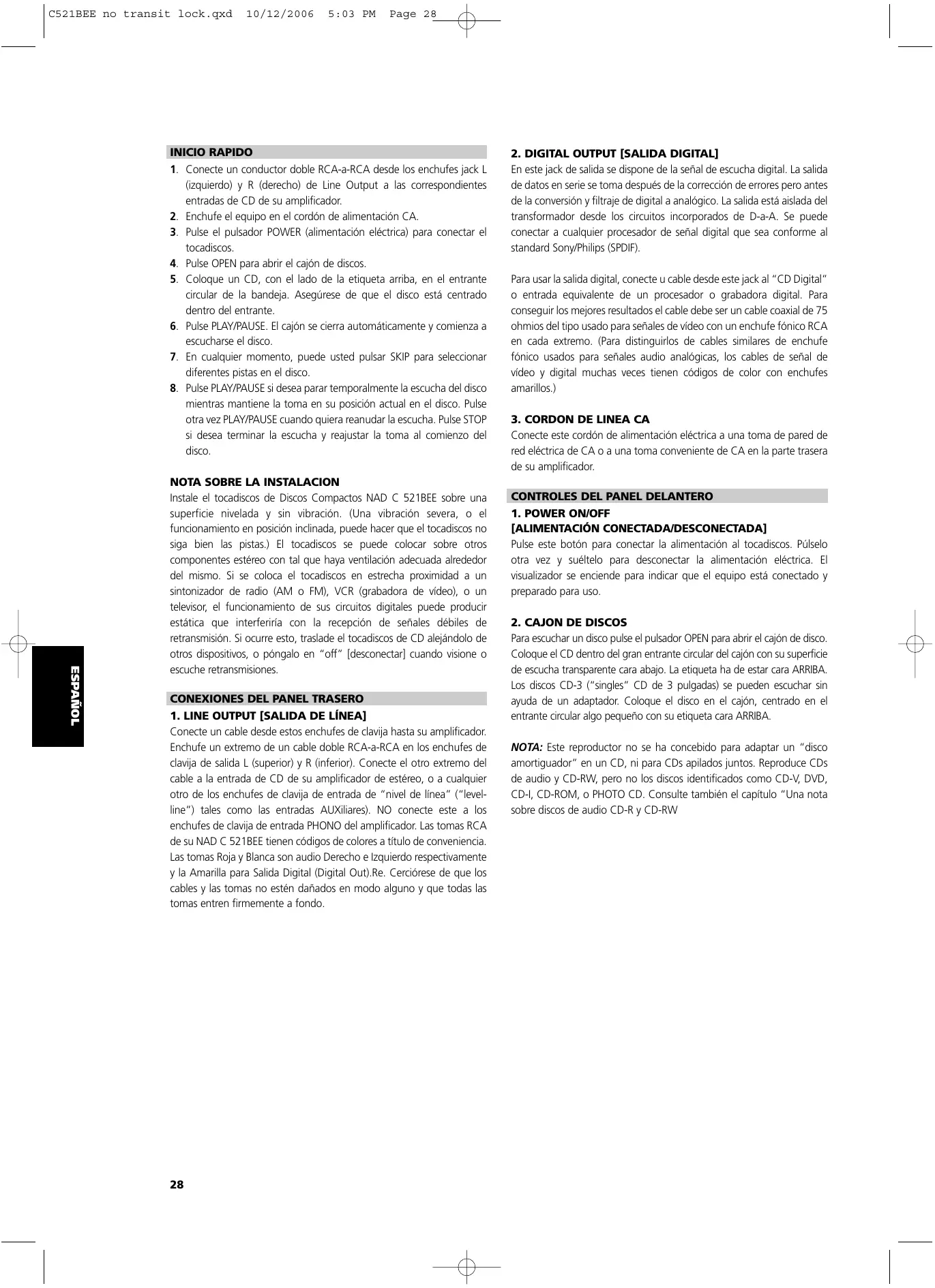 1. LINE OUTPUT [SALIDA DE LÍNEA] Conecte un cable desde estos enchufes de clavija hasta su amplificador. Enchufe un extremo de un cable doble RCA-a-RCA en los enchufes de clavija de salida L (superior) y R (inferior). Conecte el otro extremo del cable a la entrada de CD de su amplificador de estéreo, o a cualquier otro de los enchufes de clavija de entrada de “nivel de línea” (“levelline”) tales como las entradas AUXiliares). NO conecte este a los enchufes de clavija de entrada PHONO del amplificador. Las tomas RCA de su NAD C 521BEE tienen códigos de colores a título de conveniencia. Las tomas Roja y Blanca son audio Derecho e Izquierdo respectivamente y la Amarilla para Salida Digital (Digital Out).Re. Cerciórese de que los cables y las tomas no estén dañados en modo alguno y que todas las tomas entren firmemente a fondo.