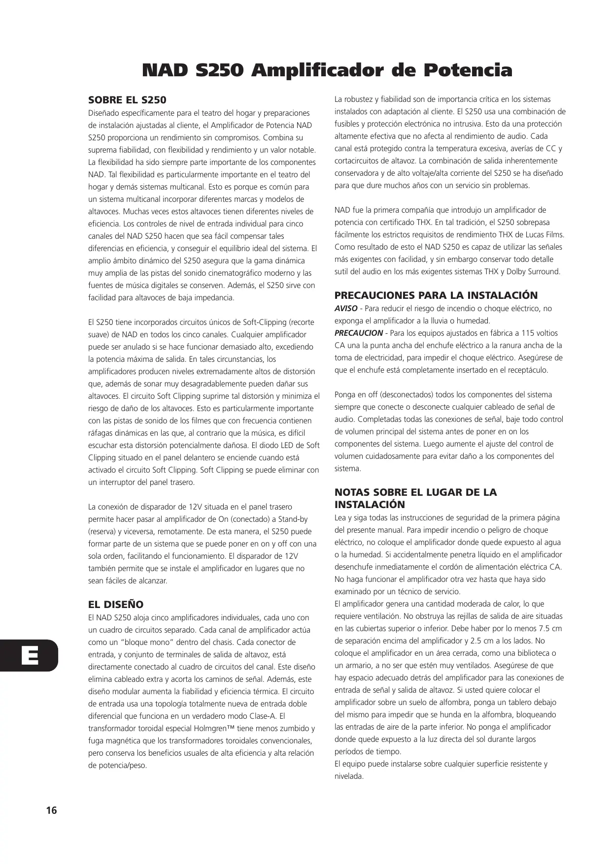 La robustez y fiabilidad son de importancia crítica en los sistemas instalados con adaptación al cliente. El S250 usa una combinación de fusibles y protección electrónica no intrusiva. Esto da una protección altamente efectiva que no afecta al rendimiento de audio. Cada canal está protegido contra la temperatura excesiva, averías de CC y cortacircuitos de altavoz. La combinación de salida inherentemente conservadora y de alto voltaje/alta corriente del S250 se ha diseñado para que dure muchos años con un servicio sin problemas. NAD fue la primera compañía que introdujo un amplificador de potencia con certificado THX. En tal tradición, el S250 sobrepasa fácilmente los estrictos requisitos de rendimiento THX de Lucas Films. Como resultado de esto el NAD S250 es capaz de utilizar las señales más exigentes con facilidad, y sin embargo conservar todo detalle sutil del audio en los más exigentes sistemas THX y Dolby Surround.