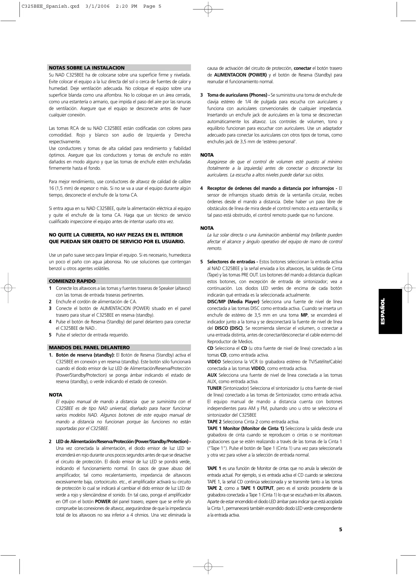 ESPAÑOL NOTAS SOBRE LA INSTALACION Su NAD C325BEE ha de colocarse sobre una superficie firme y nivelada.