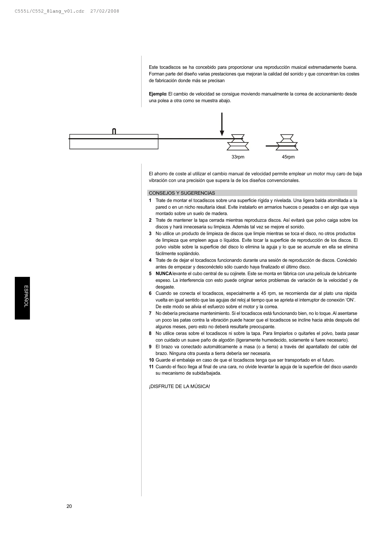 Séparation des canaux 20 dB à 1 kHz Niveau de sortie à ±2 dB 5 mV à 1 kHz, à 5 cm/s Compliance latérale statique 16 mm/N Masse équivalente à l’extrémité 0,7 mg ÉLECTRIQUES Résistance de charge 47 k-ohms Capacitance de charge 150 à 400 pF Inductance interne 560 mH Résistance interne 700 ohms MÉCANIQUES Poids de la cellule 4,2 g Axes de fixation 12,7 mm Force d’appui Séparation des canaux 22dB at 1 kHz 15dB at 15kHz Niveau de sortie à 4 mV à 1 kHz, à 5 cm/s Tracking force range 1,5-2,0 g (15-20 mN) Tracking force, recommended 5 NUNCAlevante el cubo central de su cojinete. Este se monta en fábrica con una película de lubricante espeso. La interferencia con esto puede originar serios problemas de variación de la velocidad y de desgaste. 6 Cuando se conecta el tocadiscos, especialmente a 45 rpm, se recomienda dar al plato una rápida vuelta en igual sentido que las agujas del reloj al tiempo que se aprieta el interruptor de conexión ‘ON’. De este modo se alivia el esfuerzo sobre el motor y la correa. 7 No debería precisarse mantenimiento. Si el tocadiscos está funcionando bien, no lo toque. Al asentarse un poco las patas contra la vibración puede hacer que el tocadiscos se incline hacia atrás después del algunos meses, pero esto no deberá resultarle preocupante. 8 No utilice ceras sobre el tocadiscos ni sobre la tapa. Para limpiarlos o quitarles el polvo, basta pasar con cuidado un suave paño de algodón (ligeramente humedecido, solamente si fuere necesario). 9 El brazo va conectado automáticamente a masa (o a tierra) a través del apantallado del cable del brazo. Ninguna otra puesta a tierra debería ser necesaria. 10 Guarde el embalaje en caso de que el tocadiscos tenga que ser transportado en el futuro. 11 Cuando el fisco llega al final de una cara, no olvide levantar la aguja de la superficie del disco usando su mecanismo de subida/bajada.