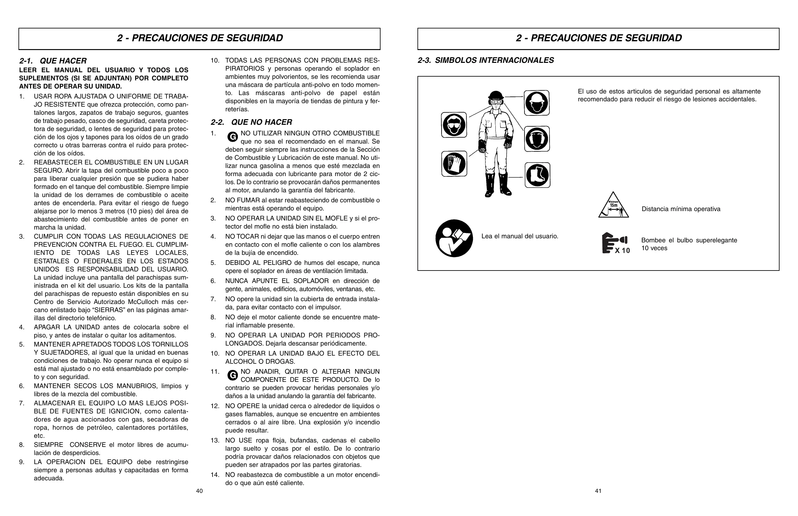 - NO UTILizar NINGUN OTRO COMBUSTIBLE que no sea el recomendado en el manual. Se deben seguir siempre las instrucciones de la Seccion de Combustible y Lubricacion de este manual. Noutilizar nunca gasolina a menos que este mezclada en forma adecuada con lubricante para motor de 2 ciclos. De lo contrario se provocan daños permanentes al motor, anulando la garantia del fabricante.