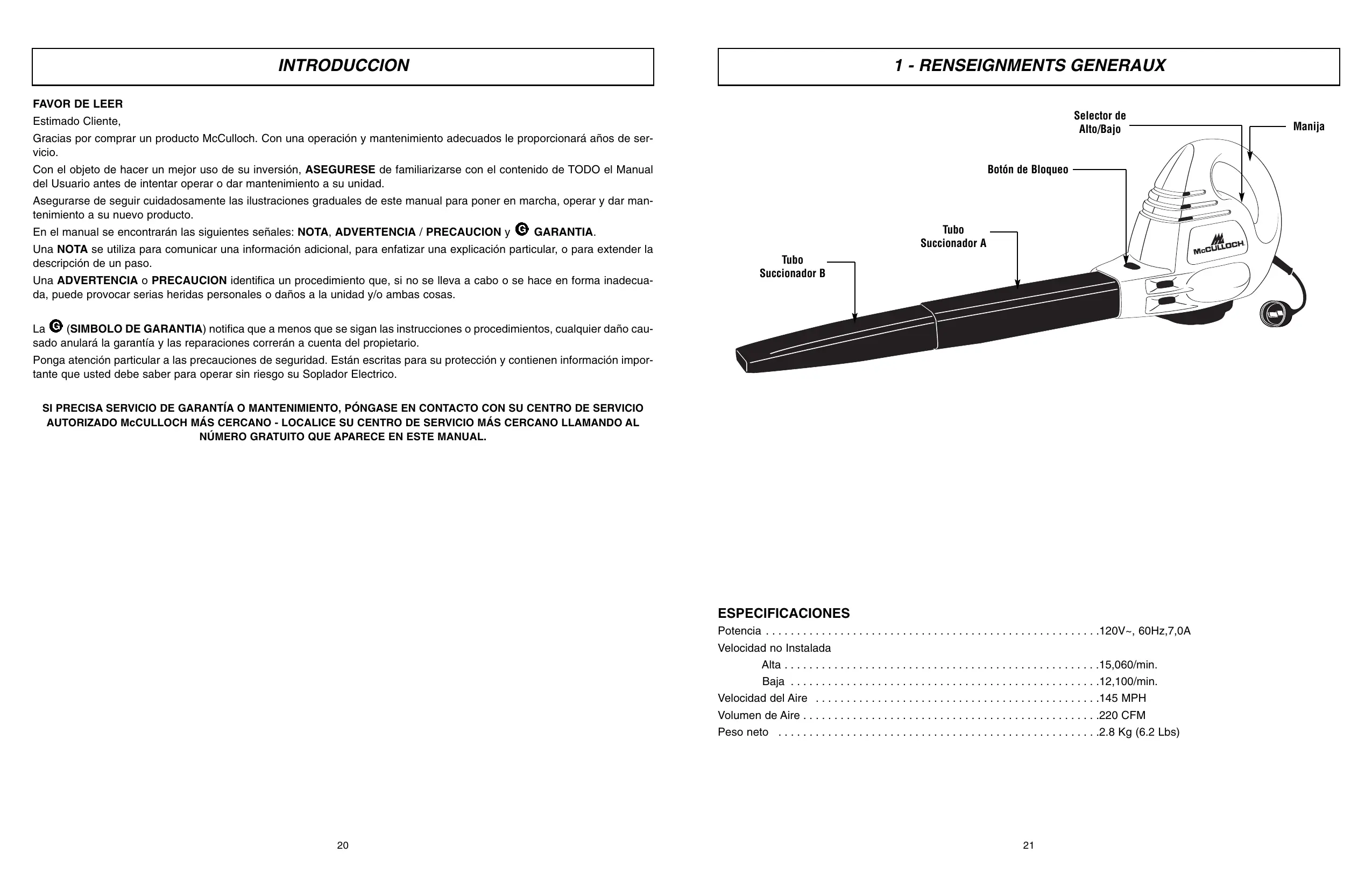 (SIMBOLO DE GARANTIA) notifica que a menos que se sigan las instrucciones o procedimientos, cualquier daño causado anulará la garantía y las reparaciones correrán a cuenta del propietario. Ponga atención particular a las precauciones de seguridad. Están escritas para su protección y contienen información importante que usted debe saber para operar sin riesgo su Soplador Electrico. SI PRECISA SERVICIO DE GARANTÍA O MANTENIMIENTO, PÓNGASE EN CONTACTO CON SU CENTRO DE SERVICIO AUTORIZADO McCULLOCH MÁS CERCANO - LOCALICE SU CENTRO DE SERVICIO MÁS CERCANO LLAMANDO AL NÚMERO GRATUITO QUE APARECE EN ESTE MANUAL.