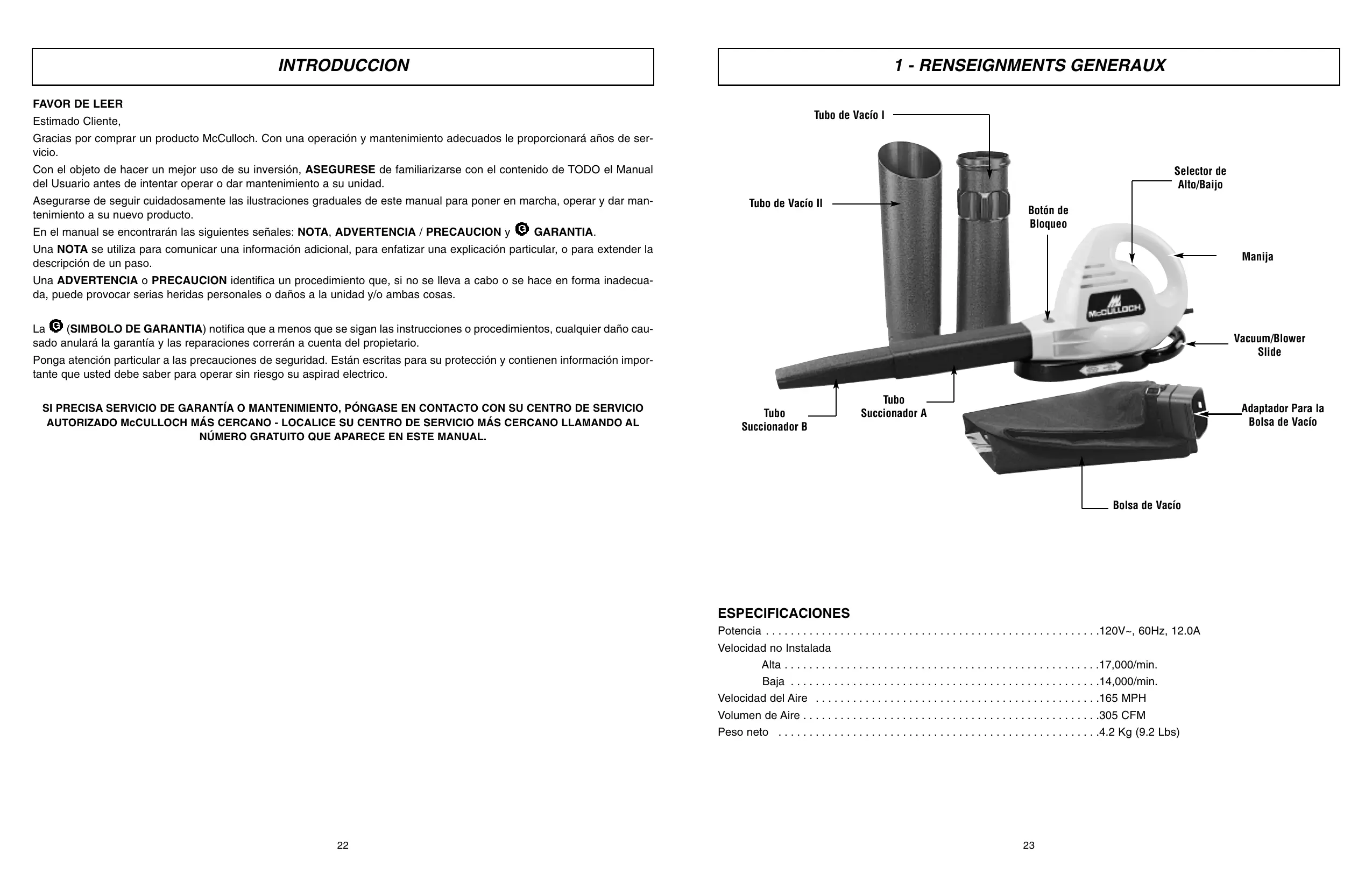 Tubo de Vacío I Estimado Cliente, Gracias por comprar un producto McCulloch. Con una operación y mantenimiento adecuados le proporcionará años de servicio. Con el objeto de hacer un mejor uso de su inversión, ASEGURESE de familiarizarse con el contenido de TODO el Manual del Usuario antes de intentar operar o dar mantenimiento a su unidad. Asegurarse de seguir cuidadosamente las ilustraciones graduales de este manual para poner en marcha, operar y dar mantenimiento a su nuevo producto. En el manual se encontrarán las siguientes señales: NOTA, ADVERTENCIA / PRECAUCION y Selector de Alto/Baijo Tubo de Vacío II Botón de Bloqueo GARANTIA. Una NOTA se utiliza para comunicar una información adicional, para enfatizar una explicación particular, o para extender la descripción de un paso. Manija Una ADVERTENCIA o PRECAUCION identifica un procedimiento que, si no se lleva a cabo o se hace en forma inadecuada, puede provocar serias heridas personales o daños a la unidad y/o ambas cosas. (SIMBOLO DE GARANTIA) notifica que a menos que se sigan las instrucciones o procedimientos, cualquier daño causado anulará la garantía y las reparaciones correrán a cuenta del propietario. Vacuum/Blower Slide Ponga atención particular a las precauciones de seguridad. Están escritas para su protección y contienen información importante que usted debe saber para operar sin riesgo su aspirad electrico. SI PRECISA SERVICIO DE GARANTÍA O MANTENIMIENTO, PÓNGASE EN CONTACTO CON SU CENTRO DE SERVICIO AUTORIZADO McCULLOCH MÁS CERCANO - LOCALICE SU CENTRO DE SERVICIO MÁS CERCANO LLAMANDO AL NÚMERO GRATUITO QUE APARECE EN ESTE MANUAL. Tubo Succionador B Tubo Succionador A Adaptador Para la Bolsa de Vacío Bolsa de Vacío