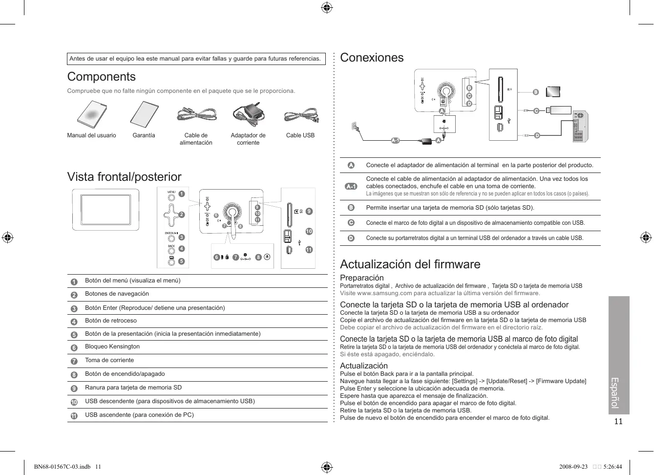 Botón del menú (visualiza el menú) Actualización del firmware Preparación Botones de navegación Portarretratos digital , Archivo de actualización del firmware , Tarjeta SD o tarjeta de memoria USB Visite www.samsung.com para actualizar la última versión del firmware. Botón Enter (Reproduce/ detiene una presentación) Conecte la tarjeta SD o la tarjeta de memoria USB al ordenador Botón de retroceso Botón de la presentación (inicia la presentación inmediatamente) Bloqueo Kensington Toma de corriente Ranura para tarjeta de memoria SD USB descendente (para dispositivos de almacenamiento USB) USB ascendente (para conexión de PC) BN68-01567C-03.indb 11 Conecte la tarjeta SD o la tarjeta de memoria USB al marco de foto digital Retire la tarjeta SD o la tarjeta de memoria USB del ordenador y conéctela al marco de foto digital. Si éste está apagado, enciéndalo. Actualización Pulse el botón Back para ir a la pantalla principal. Navegue hasta llegar a la fase siguiente: [Settings] -> [Update/Reset] -> [Firmware Update] Pulse Enter y seleccione la ubicación adecuada de memoria. Espere hasta que aparezca el mensaje de finalización. Pulse el botón de encendido para apagar el marco de foto digital. Retire la tarjeta SD o la tarjeta de memoria USB. Pulse de nuevo el botón de encendido para encender el marco de foto digital. Español Botón de encendido/apagado Conecte la tarjeta SD o la tarjeta de memoria USB a su ordenador Copie el archivo de actualización del firmware en la tarjeta SD o la tarjeta de memoria USB Debe copiar el archivo de actualización del firmware en el directorio raíz.