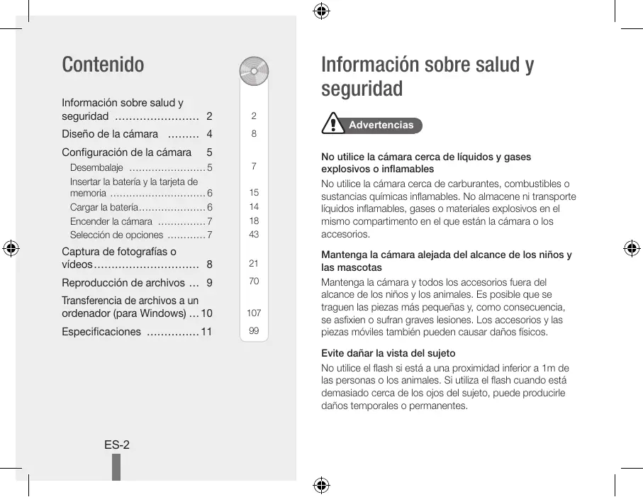 Contenido Informaciôn sobre salud y seguridad . Diseño de la câmara Configuraciôn de la cämara Desembalaje Insertar la bateria y la ra œ memoria … Cargar 1 baters…… Encender la câmara … Seleccién de opciones …. Captura de fotografias o videos aus Reproducciôn de archivos … 9 Transferencia de archivos a un ordenador (para Windows) … 10 Especificaciones .… .11 ES-2