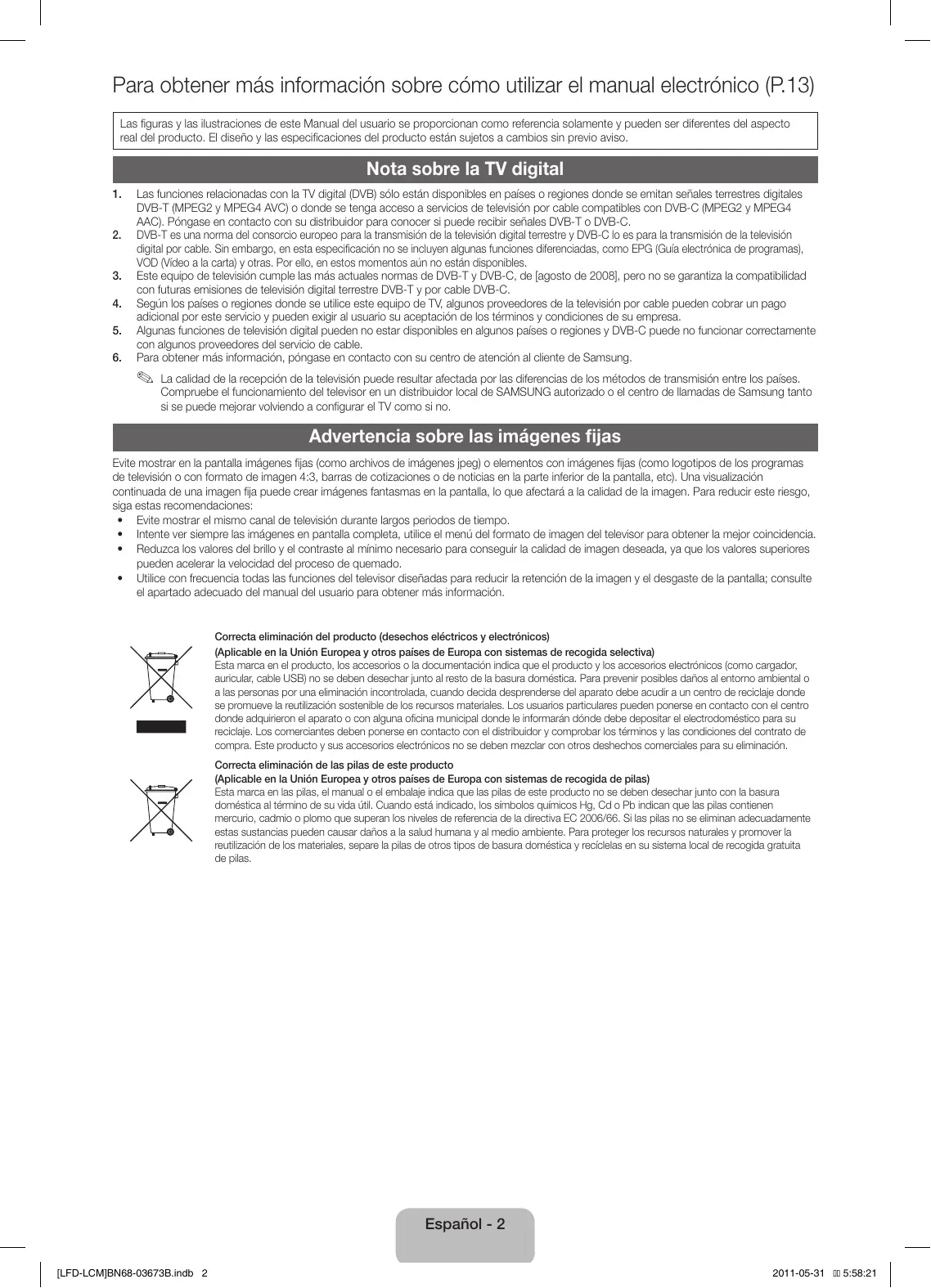 DVB-T (MPEG2 y MPEG4 AVC) o donde se tenga acceso a servicios de televisión por cable compatibles con DVB-C (MPEG2 y MPEG4 AAC). Póngase en contacto con su distribuidor para conocer si puede recibir señales DVB-T o DVB-C. DVB-T es una norma del consorcio europeo para la transmisión de la televisión digital terrestre y DVB-C lo es para la transmisión de la televisión digital por cable. Sin embargo, en esta especificación no se incluyen algunas funciones diferenciadas, como EPG (Guía electrónica de programas), VOD (Vídeo a la carta) y otras. Por ello, en estos momentos aún no están disponibles. Este equipo de televisión cumple las más actuales normas de DVB-T y DVB-C, de [agosto de 2008], pero no se garantiza la compatibilidad con futuras emisiones de televisión digital terrestre DVB-T y por cable DVB-C. Según los países o regiones donde se utilice este equipo de TV, algunos proveedores de la televisión por cable pueden cobrar un pago adicional por este servicio y pueden exigir al usuario su aceptación de los términos y condiciones de su empresa. Algunas funciones de televisión digital pueden no estar disponibles en algunos países o regiones y DVB-C puede no funcionar correctamente con algunos proveedores del servicio de cable. Para obtener más información, póngase en contacto con su centro de atención al cliente de Samsung.