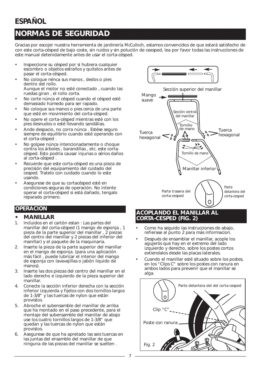 Tornillo de mano Tuerca hexagonal Parte delantera del corta-cesped Como ha seguido las instrucciones de abajo, refierase al punto 2 para más informacion. Después de ensamblar el manillar, acople los agujerós que hay en el extremo del lado izquierdo y derecho, sobre los postes cortos extiendalos desde las placas laterales. Cuando el manillar esté situado sobre los postes, en los "Clips C" sobre los postes con ranura en ambos lados para prevenir que el manillar se alga. Parte delantera del del corta-cesped Ajustando los tornillos Estas unidades pueden ser ajustados para ofrecer un rango de altura de corte desde 1/2" hasta 1-3/4" , simplemente ajustando el ensamble del rodillo. Como ha seguido las instrucciones de abajo , refierase a la fig. 3 para más información. Para lograr la posición de corte mas baja , suelte y quite las tuercas que hay en ambos lados del ensamble del rodillo . Posicione el tornillo a traves del agujero inferior de la abrazadera de plástico del rodillo y del agujero superior de la placa del lado del corta-césped . Para lograr la posicion de corte mas alta , suelte y quite las tuercas que hay en ambos lados del ensamble del rodillo . Posicione el tornillo a traves del agujero superior del rodillo de plastico y el agujero inferior de la placa del lado del corta-cesped . Otras alturas de corte pueden ser obtenidos posicionando los tornillos a traves de los agujeros de las otras localizaciones . Delante De tras Fig. 4