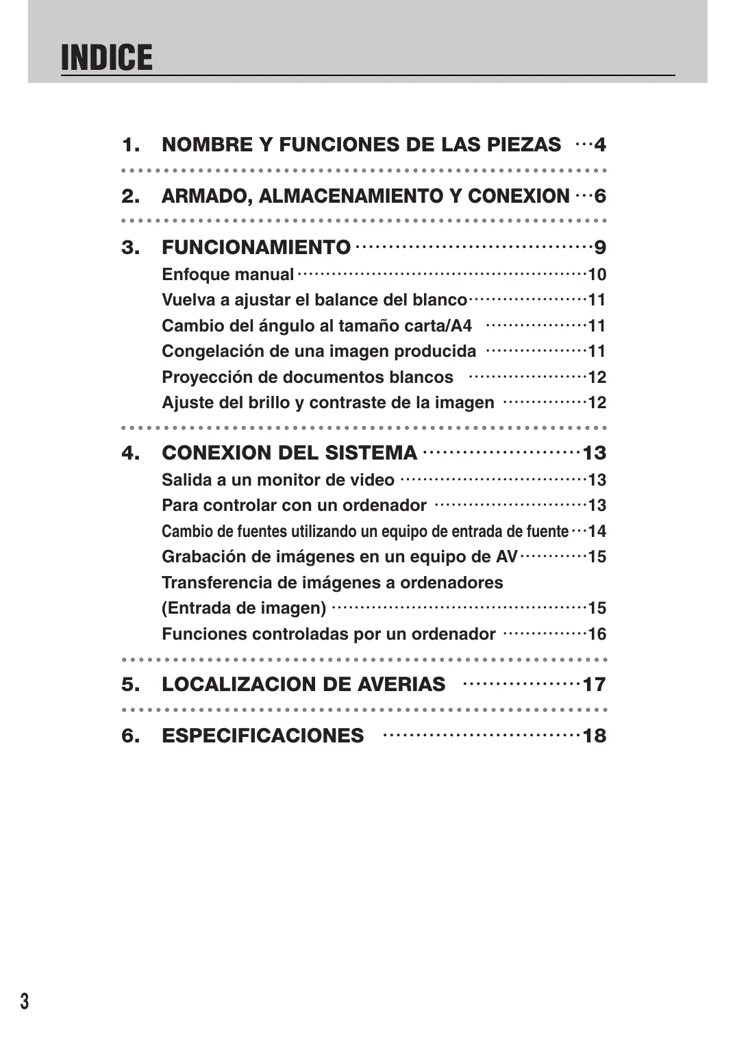 4. CONEXION DEL SISTEMA Salida a un monitor de video Para controlar con un ordenador :--: Cambio de fuentes utilizando un equipo de entrada de fuente---14 Grabaciôn de imägenes en un equipo de AV: 15 Transferencia de imägenes a ordenadores (Entrada de imagen) ------ Funciones controladas por un ordenador ---