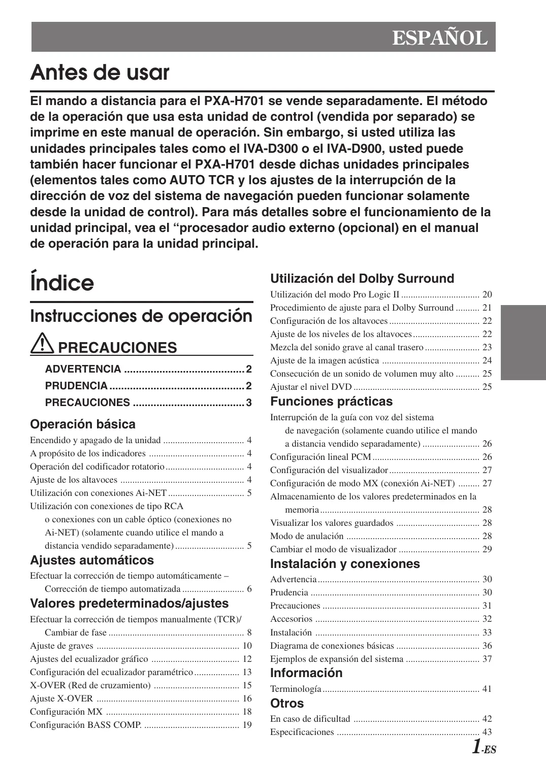 DS ZNN Antes de usar El mando a distancia para el PXA-H701 se vende separadamente. El método de la operacién que usa esta unidad de control (vendida por separado) se imprime en este manual de operacién. Sin embargo, si usted utiliza las unidades principales tales como el IVA-D300 o el IVA-D900, usted puede también hacer funcionar el PXA-H701 desde dichas unidades principales (elementos tales como AUTO TCR y los ajustes de la interrupcién de la direccién de voz del sistema de navegaciôn pueden funcionar solamente desde la unidad de control). Para mâs detalles sobre el funcionamiento de la unidad principal, vea el “procesador audio externo (opcional) en el manual de operaciôn para la unidad principal. Indice Instrucciones de operaciôn VAN PRECAUCIONES ADVERTENCIA …. PRUDENCIA .. PRECAUCIONES Operaciôn bâsica Encendido y apagado de la unidad . A propésito de los indicadores Operaciôn del codificador rotatorio Ajuste de los altavoces … Utilizaciôn con conexiones DEEE ER -NET Utilizaciôn con conexiones de tipo RCA © conexiones con un cable éptico (conexiones no Ai-NET) (solamente cuando utilice el mando a distancia vendido separadamente) … Ajustes automäticos Efectuar la correccién de tiempo automäâticamente — Correccién de tiempo automatizada … . Valores predeterminados/ajustes Efectuar la correcciôn de tiempos manualmente (TCR)/ Cambiar de fas Ajuste de graves Ajustes del ecualizador gräfico . Configuracién del ecualizador paramétrico X-OVER (Red de cruzamiento) . Ajuste X-OVER Configuraciôn MX Configuraciôn BASS COMP... Utilizacién del Dolby Surround Utilizacién del modo Pro Logic Il... Procedimiento de ajuste para el Dolby Surround . Configuracién de los altavoces .… Ajuste de los niveles de los altavoces Mezcla del sonido grave al canal traser Ajuste de la imagen acüstica . Consecucién de un sonido de volumen muy alto . Ajustar el nivel DVD. Funciones prâcticas Interrupcién de la gufa con voz del sistema de navegaciôn (solamente cuando utilice el mando a distancia vendido separadamente) Configuraciôn lineal PCM . Configuraciôn del visualizado: Configuracién de modo MX (conexiôn Ai-NET) Almacenamiento de los valores predeterminados en la memoria …. Visualizar los valores guardados Modo de anulacién . Cambiar el modo de visualizador Instalacién y conexiones Advertencia. Prudencia Precauciones Accesorios Instalaciôn … Diagrama de conexiones bâ Ejemplos de expansiôn del sistema Informaciéôn Terminologfa… Otros En caso de dificultad Especificaciones .