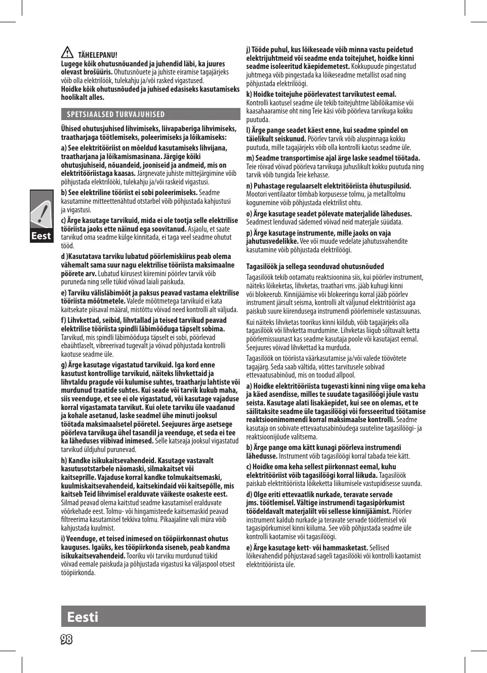 kauguses. Igaüks, kes tööpiirkonda siseneb, peab kandma e) Ärge kasutage kett- või hammasketast. Sellised isikukaitsevahendeid. Tooriku või tarviku murdunud tükid lõikevahendid põhjustavad sageli tagasilööki või kontrolli kaotamist võivad eemale paiskuda ja põhjustada vigastusi ka väljaspool otsest elektritööriista üle. tööpiirkonda. TÄHELEPANU! Lugege kõik ohutusnõuanded ja juhendid läbi, ka juures olevast brošüüris. Ohutusnõuete ja juhiste eiramise tagajärjeks võib olla elektrilöök, tulekahju ja/või rasked vigastused. Hoidke kõik ohutusnõuded ja juhised edasiseks kasutamiseks hoolikalt alles. Eest Eesti