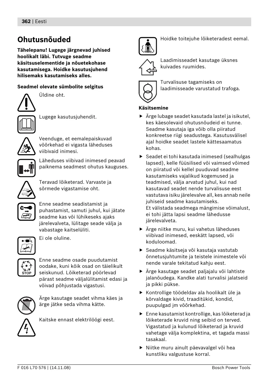 Üldine oht. Käsitsemine Lugege kasutusjuhendit. Veenduge, et eemalepaiskuvad võõrkehad ei vigasta läheduses viibivaid inimesi. Läheduses viibivad inimesed peavad paiknema seadmest ohutus kauguses. Teravad lõiketerad. Varvaste ja sõrmede vigastamise oht. Enne seadme seadistamist ja puhastamist, samuti juhul, kui jätate seadme kas või lühikeseks ajaks järelevalveta, lülitage seade välja ja vabastage kaitselüliti. Ei ole oluline. STOP Enne seadme osade puudutamist oodake, kuni kõik osad on täielikult seiskunud. Lõiketerad pöörlevad pärast seadme väljalülitamist edasi ja võivad põhjustada vigastusi. Ärge kasutage seadet vihma käes ja ärge jätke seda vihma kätte. Kaitske ennast elektrilöögi eest. f Ärge lubage seadet kasutada lastel ja isikutel, kes käesolevaid ohutusnõudeid ei tunne. Seadme kasutaja iga võib olla piiratud konkreetse riigi seadustega. Kasutusvälisel ajal hoidke seadet lastele kättesaamatus kohas. f Seadet ei tohi kasutada inimesed (sealhulgas lapsed), kelle füüsilised või vaimsed võimed on piiratud või kellel puuduvad seadme kasutamiseks vajalikud kogemused ja teadmised, välja arvatud juhul, kui nad kasutavad seadet nende turvalisuse eest vastutava isiku järelevalve all, kes annab neile juhiseid seadme kasutamiseks. Et välistada seadmega mängimise võimalust, ei tohi jätta lapsi seadme lähedusse järelevalveta. f Ärge niitke muru, kui vahetus läheduses viibivad inimesed, eeskätt lapsed, või koduloomad. f Seadme käsitseja või kasutaja vastutab õnnetusjuhtumite ja teistele inimestele või nende varale tekitatud kahju eest. f Ärge kasutage seadet paljajalu või lahtiste jalanõudega. Kandke alati turvalisi jalatseid ja pikki pükse. f Kontrollige töödeldav ala hoolikalt üle ja kõrvaldage kivid, traaditükid, kondid, puupulgad jm võõrkehad. f Enne kasutamist kontrollige, kas lõiketerad ja lõiketerade kruvid ning seibid on terved. Vigastatud ja kulunud lõiketerad ja kruvid vahetage välja komplektina, et tagada massi tasakaal. f Niitke muru ainult päevavalgel või hea kunstliku valgustuse korral. F 016 L70 576 | (14.11.08) Bosch Power Tools Eesti | 363 f Võimaluse korral ärge kasutage seadet niiske muru puhul. f Liikuge alati mõõduka tempoga, ärge kunagi jookske. f Ärge kasutage seadet, kui kaitseseadised või katted, näiteks põrkekaitse ja/või rohukogumiskorv, on defektsed või puuduvad. f Töötamine kallakutel võib olla ohtlik. – Ärge kasutage seadet väga järskudel nõlvadel. – Nõlvadel ja märjal rohul säilitage stabiilne asend. – Kallakutel liikuge alati vasakule-paremale ja mitte üles-alla. – Nõlvadel suunda muutes olge äärmiselt ettevaatlik. f Seadmega tagurpidi liikudes või seadet tõmmates olge äärmiselt ettevaatlik. f Lükake seadet niitmisel alati ettepoole ja ärge kunagi tõmmake seda enda suunas. f Lõiketerad ei tohi liikuda, kui seadet transportimiseks kallutate, kui sõidate üle alade, mis ei ole muruga kaetud, ning kui toimetate seadme niidetavale alale või sealt ära. f Ärge kallutage seadet mootori käivitamisel, välja arvatud juhul, kui see on vajalik kõrges rohus käivitamiseks. Sellisel juhul kergitage seadme seda külge, mis ei jää kasutaja poole, vajutades käepidet alla vaid niipalju kui tingimata vajalik. Veenduge, et hoiate seadme allalaskmisel käepidemest kinni. f Lülitage seade kasutusjuhendis toodud viisil sisse ja veenduge, et Teie jalad on pöörlevatest osadest piisaval kaugusel. – enne seadme kontrollimist, puhastamist või seadistustööde tegemist, – pärast võõrkehaga kokkupuutumist. Kontrollige seadet kohe kahjustuste suhtes ja laske seade vajaduse korral parandada, – kui seade hakkab ebaharilikult vibreerima (kohe kontrollida). Hooldus f Veenduge, et kõik mutrid, poldid ja kruvid on kõvasti kinni keeratud ja et seade on korrektselt kokku pandud. f Kontrollige regulaarselt rohukogumiskorvi seisundit ja kulumise astet. f Kontrollige seadet ja asendage kulunud ja vigastatud osad tööohutuse tagamiseks uutega. f Kasutage üksnes seadme jaoks ette nähtud lõiketerasid. f Veenduge, et varuosad pärinevad Boschilt. f Kandke alati aiakindaid, kui reguleerite seadet teravate lõiketerade piirkonnas. Juhised aku käsitsemiseks f Enne aku paigaldamist veenduge, et seade on välja lülitatud. Aku paigaldamine seadmesse, mis on sisse lülitatud, võib põhjustada vigastusi. f Ärge jätke akulaadijat vihma ega niiskuse kätte. Vee sissetungimine elektrilisse tööriista suurendab elektrilöögi ohtu. f Laadige akut üksnes tootja poolt ette nähtud akulaadimisseadmega. Ühte tüüpi akude jaoks sobiv akulaadimisseade võib teist tüüpi akude laadimisel põhjustada põlengu ohu. f Seadmega töötades olge väljaviskeavast piisaval kaugusel. f Ärge laadige teist tüüpi akusid. Akulaadijaga tohib laadida ainult Boschi liitium-ioonakusid, mille pinge jääb tehnilistes andmetes nimetatud vahemikku. Selle nõude eiramisel tekib tulekahju- ja plahvatusoht. f Ärge kunagi tõstke ega kandke töötava mootoriga seadet. f Hoidke akulaadija puhas. Mustus tekitab elektrilöögi ohu. f Ärge viige oma käsi ja jalgu pöörlevate osade lähedusse või alla. Vabastage kaitselüliti: – alati, kui seadme juurest lahkute, – enne kinnikiildumiste kõrvaldamist, Bosch Power Tools F 016 L70 576 | (14.11.08) 364 | Eesti f Iga kord enne kasutamist kontrollige üle laadija, toitejuhe ja pistik. Vigastuste tuvastamisel ärge akulaadijat kasutage. Ärge avage akulaadijat ise ja laske seda parandada vaid vastava ala spetsialistidel, kes kasutavad originaalvaruosi. Vigastatud akulaadija, toitejuhe ja pistik suurendavad elektrilöögi ohtu. Tööpõhimõtte kirjeldus f Ärge kasutage akulaadijat kergestisüttival pinnal (nt paberil, tekstiilidel jmt) ja süttimisohtlikus keskkonnas. Akulaadija kuumeneb laadimisel, mistõttu tekkib tulekahjuoht. Nõuetekohane kasutamine f Kasutage seadmes ainult selleks ette nähtud akut. Teiste akude kasutamine võib põhjust