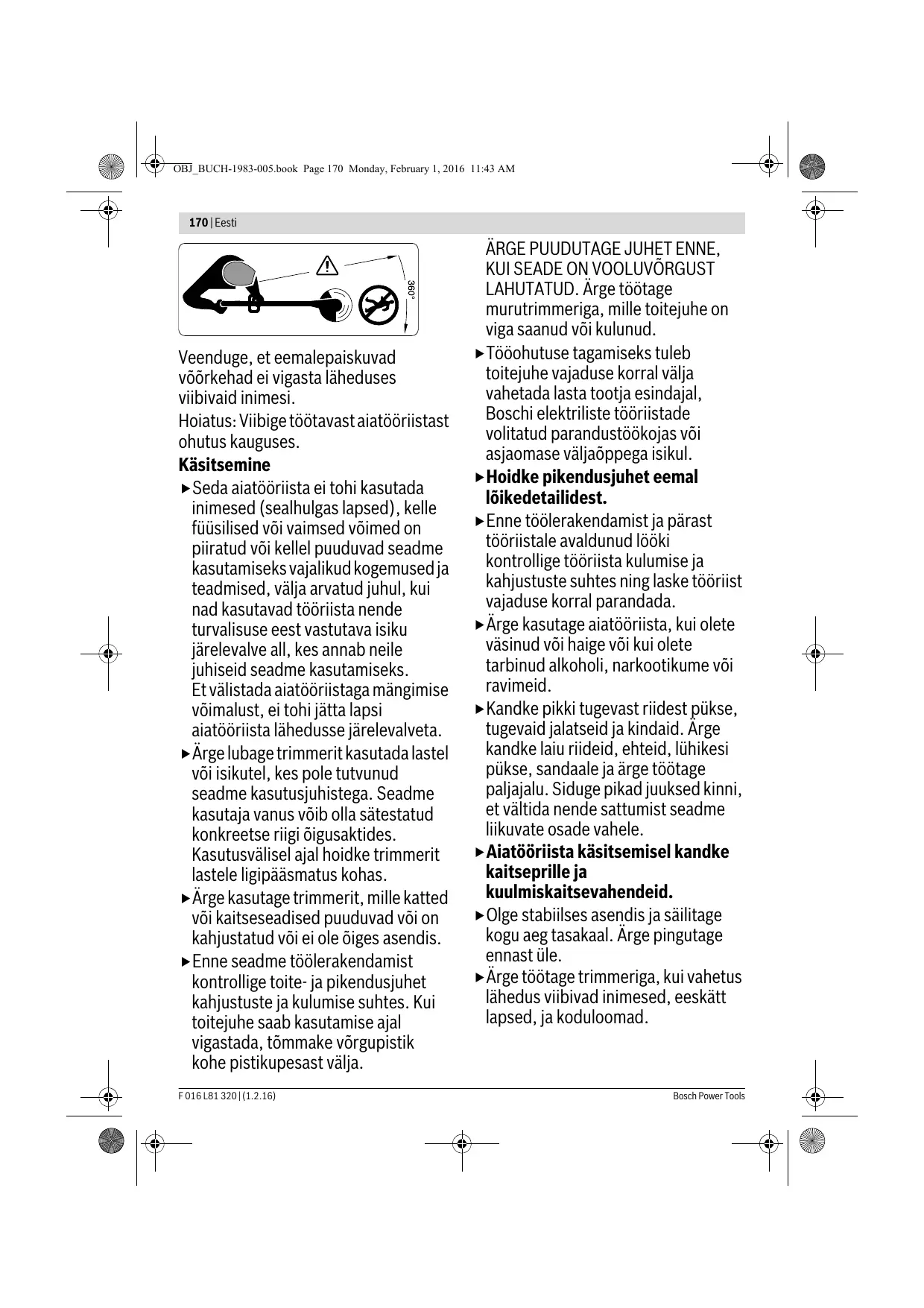 LAHUTATUD. Ärge töötage murutrimmeriga, mille toitejuhe on viga saanud või kulunud. Tööohutuse tagamiseks tuleb toitejuhe vajaduse korral välja vahetada lasta tootja esindajal, Boschi elektriliste tööriistade volitatud parandustöökojas või asjaomase väljaõppega isikul. Hoidke pikendusjuhet eemal lõikedetailidest. Enne töölerakendamist ja pärast tööriistale avaldunud lööki kontrollige tööriista kulumise ja kahjustuste suhtes ning laske tööriist vajaduse korral parandada. Ärge kasutage aiatööriista, kui olete väsinud või haige või kui olete tarbinud alkoholi, narkootikume või ravimeid. Kandke pikki tugevast riidest pükse, tugevaid jalatseid ja kindaid. Ärge kandke laiu riideid, ehteid, lühikesi pükse, sandaale ja ärge töötage paljajalu. Siduge pikad juuksed kinni, et vältida nende sattumist seadme liikuvate osade vahele. Aiatööriista käsitsemisel kandke kaitseprille ja kuulmiskaitsevahendeid. Olge stabiilses asendis ja säilitage kogu aeg tasakaal. Ärge pingutage ennast üle. Ärge töötage trimmeriga, kui vahetus lähedus viibivad inimesed, eeskätt lapsed, ja koduloomad. Bosch Power Tools OBJ_BUCH-1983-005.book Page 171 Monday, February 1, 2016 11:43 AM Eesti | 171 Seadme käsitseja või kasutaja vastutab õnnetusjuhtumite ja teistele inimestele või nende varale tekitatud kahju eest. Ärge puudutage pöörlevaid lõikeelemente enne, kui need on täielikult seiskunud. Lõikeelemendid pöörlevad pärast trimmeri väljalülitamist edasi ja võivad põhjustada vigastusi. Töötage trimmeriga ainult päevavalgel või hea kunstliku valgustuse korral. Ärge rakendage trimmerit tööle, kui ilm on halb, eeskätt kui lähenemas on äike. Trimmeri kasutamine märja muru puhul vähendab jõudlust. Trimmeri transportimisel töökohta või töökohalt tagasi peab trimmer olema välja lülitatud. Lülitage trimmer sisse vaid siis, kui Teie käed ja jalad on pöörlevatest lõikeelementidest piisaval kaugusel. Ärge viige oma käsi ega jalgu pöörlevate lõikeelementide lähedusse. Ärge kasutage selles trimmeris metallist lõikeelemente. Kontrollige ja hooldage trimmerit korrapäraselt. Laske trimmerit alati parandada volitatud remonditöökojas. Veenduge alati, et seadme ventilatsiooniavades ei ole rohujääke. Olge ettevaatlik, kuna integreeritud tera, mis lõikab lõikeniidi sobivasse pikkusesse, võib tekitada Bosch Power Tools kehavigastusi. Pärast lõikeniidi lisamist/järeleandmist keerake trimmer alati horisontaalasendisse, enne kui selle sisse lülitate. Lülitage aiatööriist välja ja eemaldage võrgupistik pistikupesast: – alati, kui jätate seadme järelevalveta – enne pooli vahetamist – enne trimmeri puhastamist ja seadistamist Pärast töö lõpetamist tõmmake võrgupistik pistikupesast välja ja kontrollige aiatööriista kahjustuste suhtes. Hoidke aiatööriista ohutus, kuivas, lastele ligipääsmatus kohas. Ärge asetage aiatööriista peale teisi esemeid. Kulunud ja kahjustatud osad vahetage ohutuse huvides välja. Veenduge, et varuosad pärinevad Boschilt. Ärge rakendage aiatööriista tööle, kui aiatööriista juurde kuuluvad detailid on külge monteerimata. Elektriline ohutus Tähelepanu! Enne hooldus- ja puhastustöid lülitage aiatööriist välja ja eemaldage toitepistik pistikupesast. Lülitage seade välja ka juhul, kui toitejuhe on vigastatud või keerdu läinud. Pärast murutrimmeri väljalülitamist pöörleb lõikeniit veel mõne sekundi edasi. Ettevaatust – ärge puudutage pöörlevat lõikeniiti. F 016 L81 320 | (1.2.16) OBJ_BUCH-1983-005.book Page 172 Monday, February 1, 2016 11:43 AM 172 | Eesti Aiatööriist on topeltisoleeritud ja ei vaja maandamist. Tööpinge on 230 V AC, 50 Hz (EL-i mittekuuluvates riikides 220 V, 240 V sõltuvalt mudelist). Kasutage üksnes heakskiidetud pikendusjuhtmeid. Lisateavet saate volitatud müügiesindustest. Turvalisuse suurendamiseks soovitame kasutada max 30 mA käivitusvooluga rikkevoolukaitselülitit (RCD). Rikkevoolukaitselüliti tuleks iga kord enne seadme kasutamist üle kontrollida. Märkus toodete kohta, mida ei turustata Suurbritannias: TÄHELEPANU: Teie ohutuse huvides tuleb aiatööriista küljes olev pistik ühendada pikendusjuhtmega. Pikendusjuhtme pistik peab olema kaitstud veepritsmete eest, valmistatud kummist või kaetud kummiga. Pikendusjuhet tuleb kasutada koos veojõu leevendiga. Toitejuhet tuleb korrapäraselt kontrollida vigastuste suhtes ja seda tohib kasutada üksnes siis, kui see on laitmatus seisukorras. Kui toitejuhe on vigastatud, tuleb see lasta parandada Boschi elektriliste tööriistade volitatud remonditöökojas. Kasutada tohib üksnes H05VV-F või H05RN-F tüüpi pikendusjuhtmeid. Sümbolid Järgmised piltsümbolid on olulised kasutusjuhendi lugemisel ja mõistmisel. Pidage palun piltsümbolid ja nende tähendus meeles. Piltsümbolite õige tõlgendamine aitab Teil aiatööriista tõhusamalt ja ohutumalt käsitseda. Sümbol Tähendus Kandke kaitsekindaid Liikumissuund Reaktsioonisuund Kaal Sisselülitamine Väljalülitamine Lubatud toiming Keelatud toiming Kuuldav heli CLICK! Lisatarvikud/varuosad Nõuetekohane kasutamine Seade on ette nähtud (kõrgema kui 25 cm) muru ja umbrohu niitmiseks puhmaste ja põõsaste alt, samuti nõlvade ja servade niitmiseks, kuhu ei pääse ligi muruniidukiga. Seadme nõuetekohane kasutamine on lubatud temperatuuril 0 °C kuni 40 °C. Tehnilised andmed Murutrimmer ART 24 ART 24+ ART 27 ART 27+ ART 30 ART 30+ Tootenumber