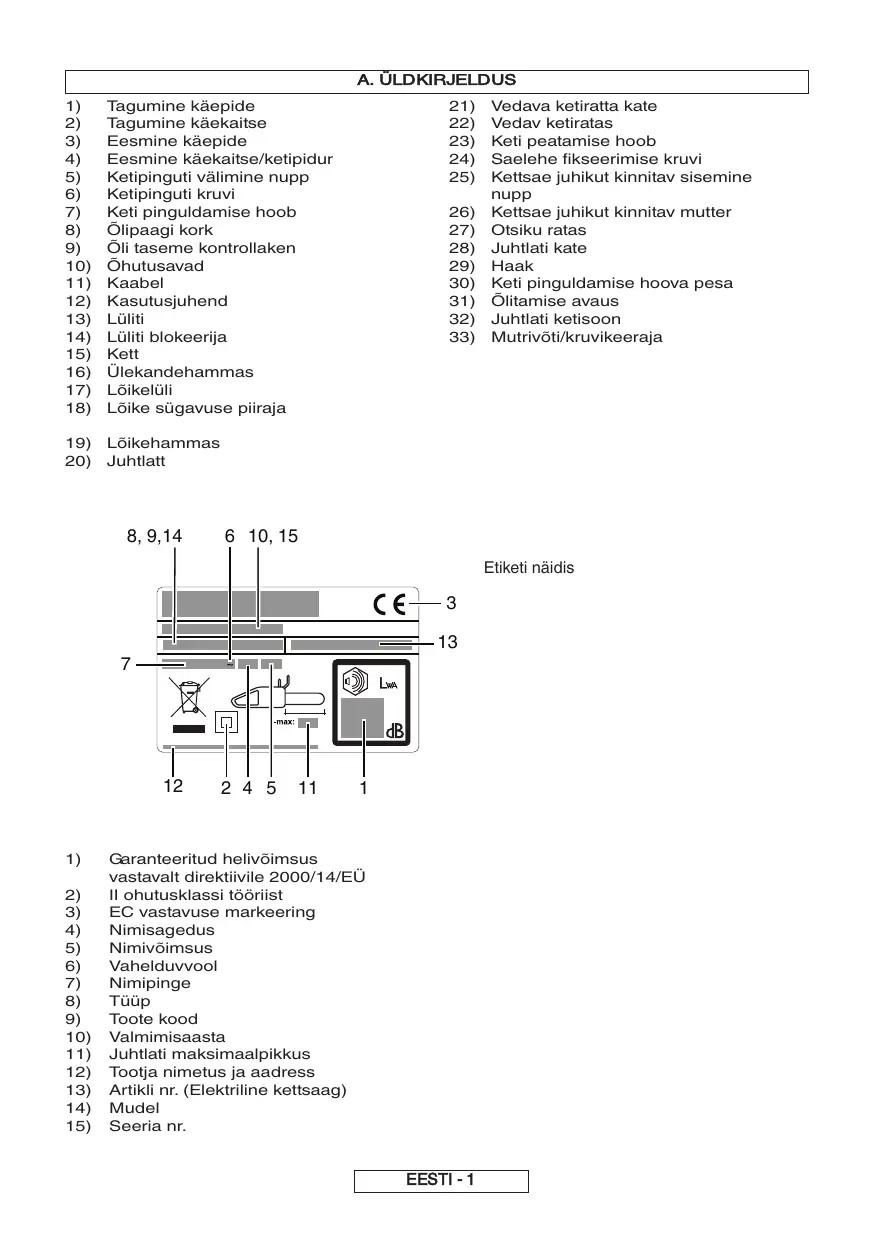 10) 11) 12) 13) 14) 15) 16) 17) 18) Tagumine käepide Tagumine käekaitse Eesmine käepide Eesmine käekaitse/ketipidur Ketipinguti välimine nupp Ketipinguti kruvi Keti pinguldamise hoob Õlipaagi kork Õli taseme kontrollaken Õhutusavad Kaabel Kasutusjuhend Lüliti Lüliti blokeerija Kett Ülekandehammas Lõikelüli Lõike sügavuse piiraja 19) 20) Lõikehammas Juhtlatt 8, 9,14 21) 22) 23) 24) 25) 26) 27) 28) 29) 30) 31) 32) 33) Vedava ketiratta kate Vedav ketiratas Keti peatamise hoob Saelehe fikseerimise kruvi Kettsae juhikut kinnitav sisemine nupp Kettsae juhikut kinnitav mutter Otsiku ratas Juhtlati kate Haak Keti pinguldamise hoova pesa Õlitamise avaus Juhtlati ketisoon Mutrivõti/kruvikeeraja 6 10, 15 Etiketi näidis