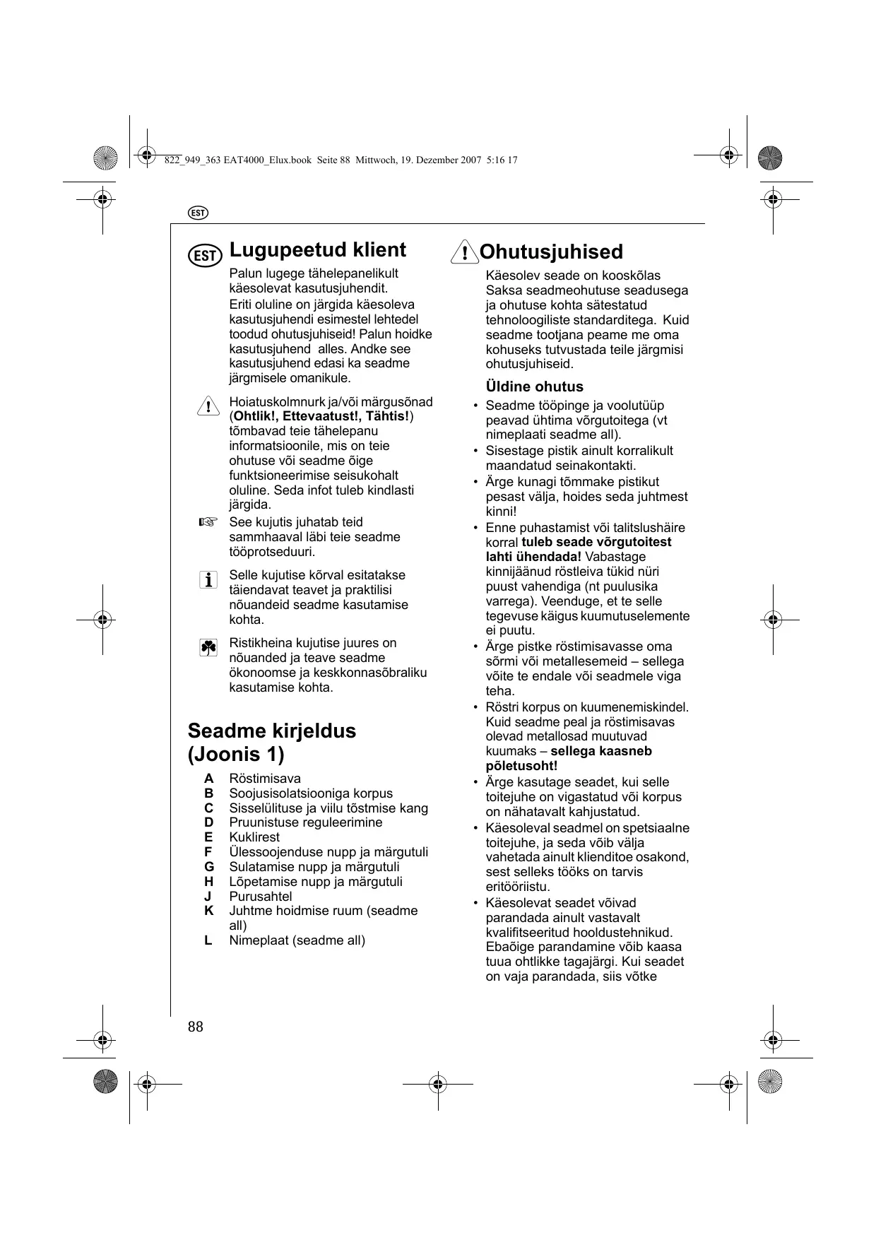 Hoiatuskolmnurk ja/voi margusonad (Ohtlik!, Ettevaatust!, Tähtis!) tombavad teie tahelepanu informatssoonile, mis on teie ohutuse voi seadme öige funktsioneerimise seisukohalt oluline. Seda infot tuleb kindlasti järgida.