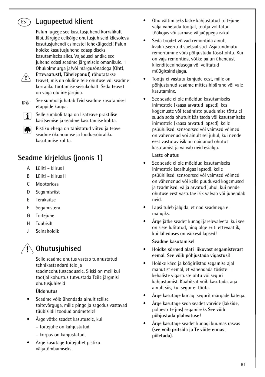 Ettevaatust!, Tahelepanu!) rohutatakse teavet, mis on oluline teie ohutuse voi seadmokorraliku tootamise seiukohalt. Seda tevet on vaga oluline jrgida.
