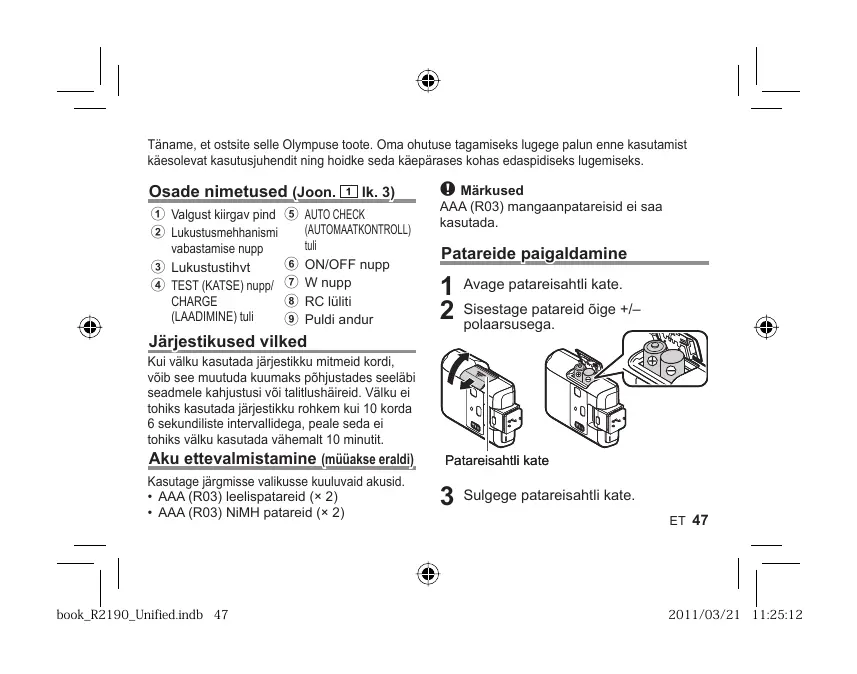 • Ärge kasutage seda kohtades, kus esineb süttimis- või plahvatusohtlikku gaasi. Vastasel korral võib tagajärjeks olla tulekahju või plahvatus. • Ärge jootke toodet, modifitseerige, ehitage ümber ega demonteerige seda. • Ärge katke välgu valgust kiirgavat ala oma käega ega puudutage valgust kiirgavat ala peale järjestikust pildistamist. See võib põletada teie nahka. • Seadme sisemusse sattunud vesi ja võõrained võivad põhjustada süttimist või elektrilööki. Kui seade on vette kastetud või olnud sellele avatud või on võõrained sattunud seadme sisemusse, lülitage koheselt toide välja ning eemaldage ettevaatlikult patareid. Võtke ühendust edasimüüjaga või pidage nõu Olympuse volitatud teeninduskeskusega. • Liiklusõnnetuste vältimiseks ärge suunake välku mootorsõidukit juhtivale inimesele. • Ärge kasutage välku pildistava silmade lähedal; eriti hoolikas tuleb olla imikuid pildistades. Ärge jätke välku lastele kättesaadavasse kohta. Välk võib põhjustada nägemishäireid. • Ärge kasutage patareisid, mis ei ole selle välklambiga kasutamiseks mõeldud. • Ärge kasutage koos vanu ja uusi ning erinevate tootjate poolt valmistatud patareisid. • Ärge ühendage materjale, nagu metall, patareide (+) ja (–) poolustega.