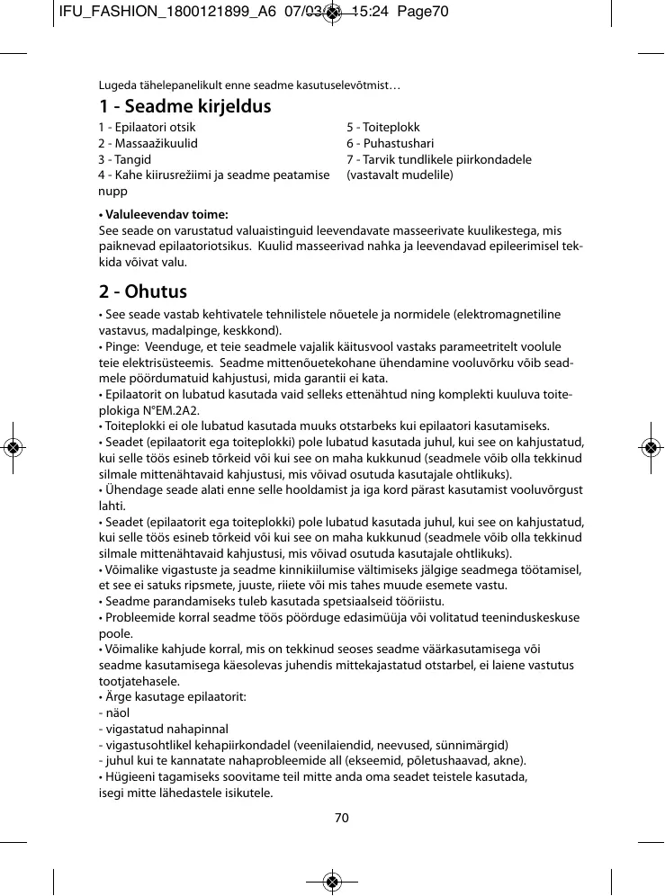 • Ne pas utiliser le bloc d'alimentation pour un autre usage que celui de l'épilateur. • Ne jamais utiliser l'appareil (épilateur ou bloc d'alimentation) s'il est endommagé, en cas d'anomalie de fonctionnement ou après une chute (des dommages non visibles peuvent être préjudiciables à votre sécurité). • Débranchez l’appareil avant toute intervention et après chaque utilisation. • N’utilisez jamais l’appareil s’il est endommagé, en cas d’anomalie de fonctionnement ou après une chute (des dommages non visibles peuvent être préjudiciables à votre sécurité). • Lorsque l’appareil est en marche, il ne doit pas rentrer en contact avec les cils, les cheveux, les vêtements, ou tout autre objet, afin d’éviter tout risque de blessure ou de blocage de l’appareil. • Cet appareil n’est réparable qu’à l’aide d’outils spéciaux. • Pour tout problème d’après-vente, adressez-vous à votre revendeur habituel ou à un Centre de Service agréé. • Nous déclinons toute responsabilité pour d’éventuels dommages résultant d’une mauvaise utilisation de l’appareil ou d’un usage autre que celui prévu dans la présente notice. • N’utilisez pas l’appareil : - sur le visage - sur une peau blessée - sur les zones à risques (varices, grains de beauté, marques de naissance) - si vous souffrez d’affections cutanées (eczéma, inflammations, acné). • Pour des raisons d’hygiène, nous vous recommandons de ne pas prêter votre appareil même dans votre environnement proche. • Cet appareil n’est pas prévu pour être utilisé par des personnes (y compris les enfants) dont les capacités physiques, sensorielles ou mentales sont réduites, ou des personnes 4