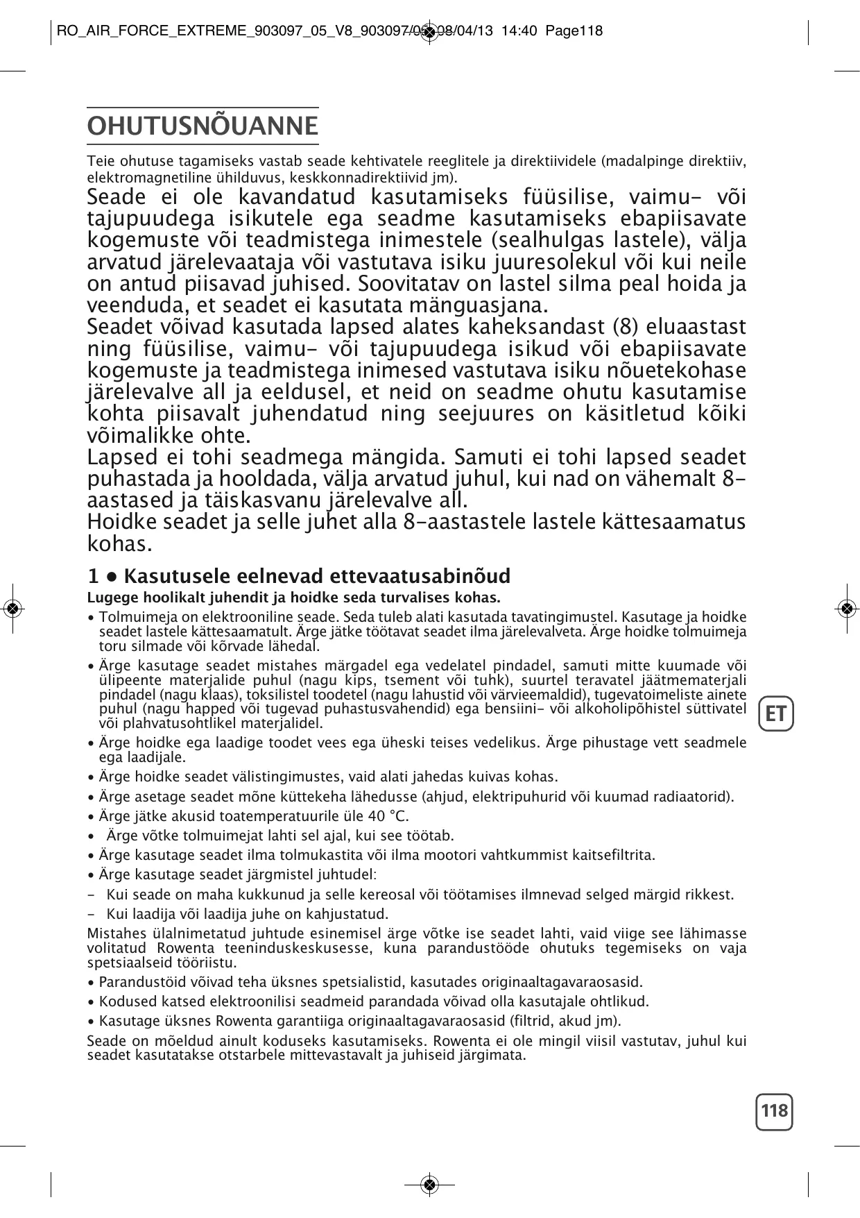Lea atentamente las instrucciones de uso antes de utilizar por primera vez el aparato: un uso no conforme con las instrucciones de uso eximiría a Rowenta de cualquier responsabilidad.