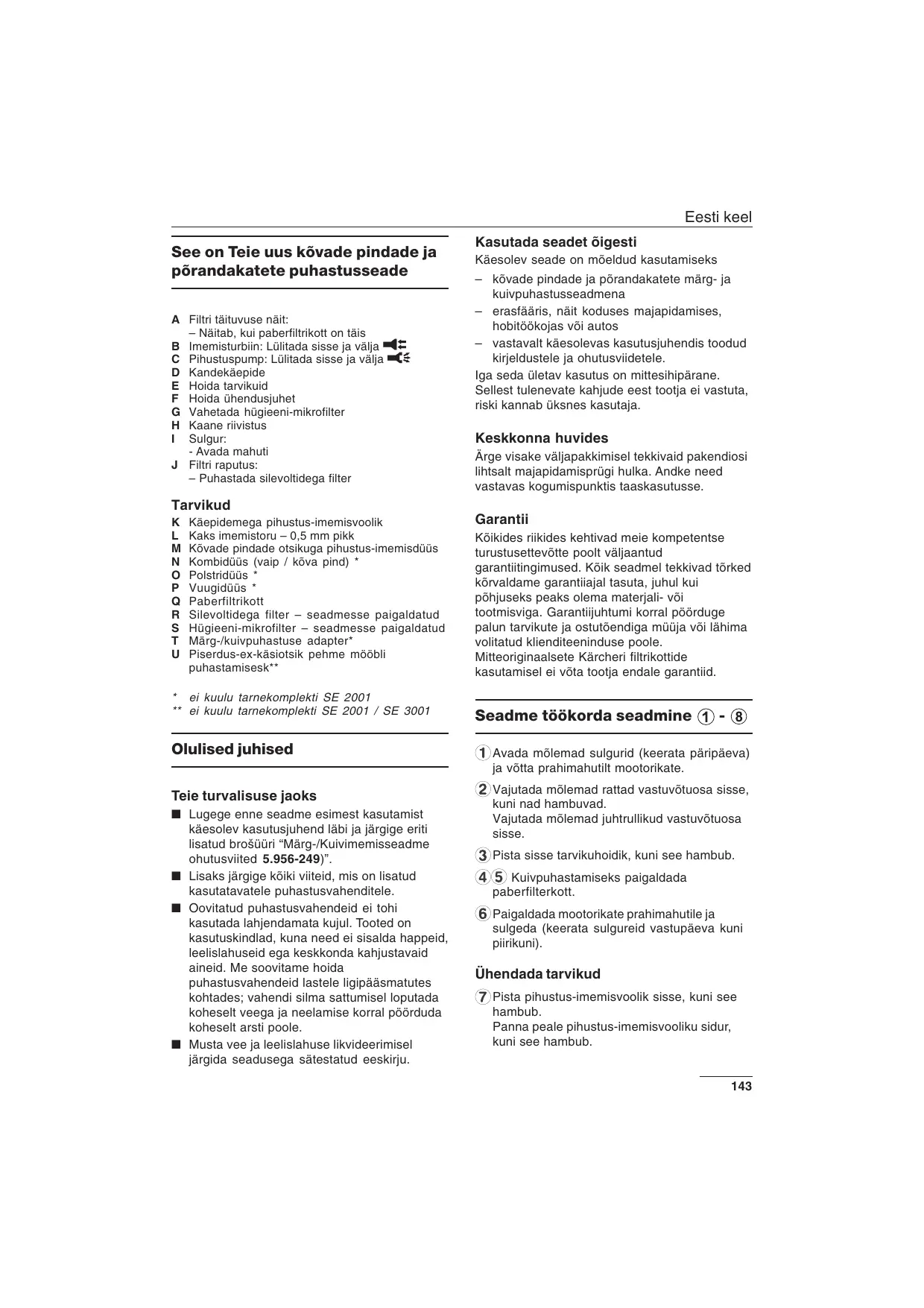 - ei kuulu tarnekomplekti SE 2001 ** ei kuulu tarnekomplekti SE 2001 / SE 3001 Garantii Kõikides riikides kehtivad meie kompetentse turustusettevõtte poolt väljaantud garantiitingimused. Kõik seadmel tekkivad tõrked kõrvaldame garantiiajal tasuta, juhul kui põhjuseks peaks olema materjali- või tootmisviga. Garantiijuhtumi korral pöörduge palun tarvikute ja ostutõendiga müüja või lähima volitatud klienditeeninduse poole. Mitteoriginaalsete Kärcheri filtrikottide kasutamisel ei võta tootja endale garantiid. Seadme töökorda seadmine