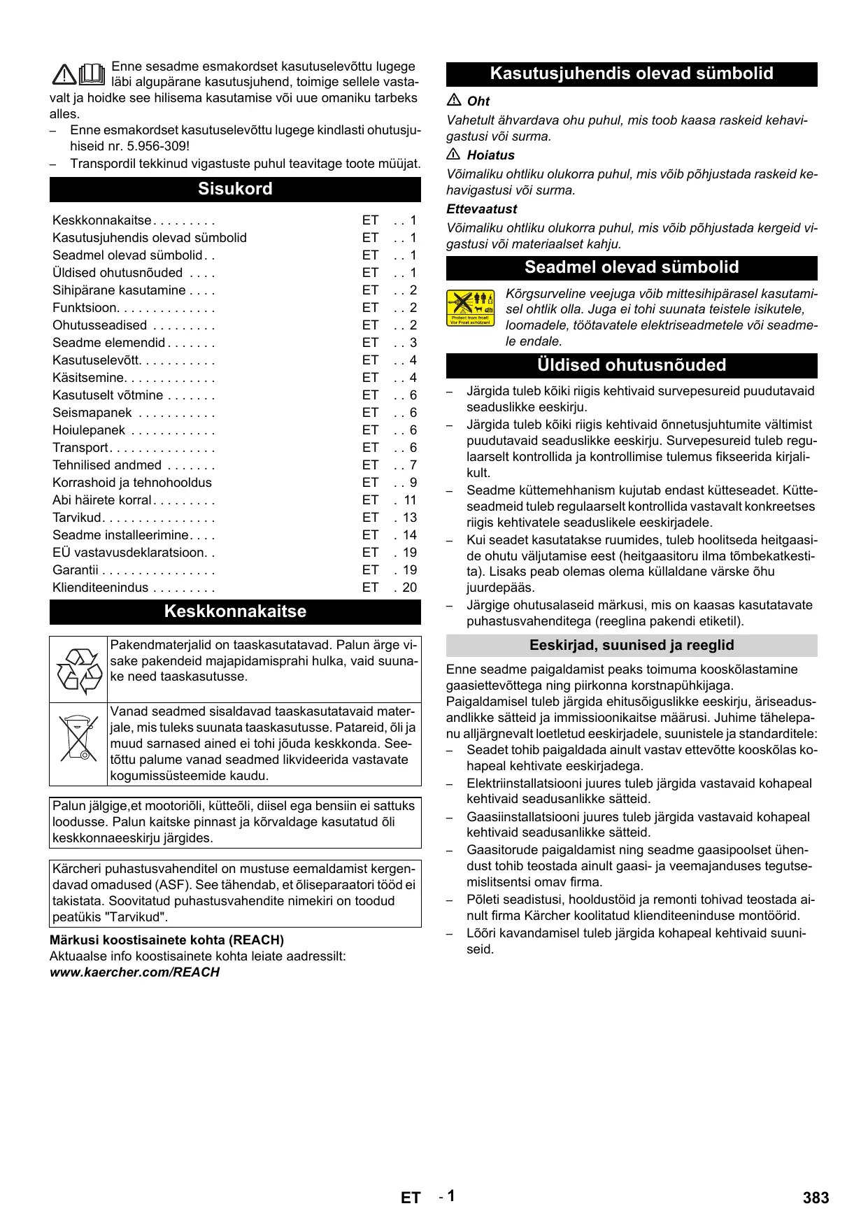 Keskkonnakaitse Pakendmaterjalid on taaskasutatavad. Palun ärge visake pakendeid majapidamisprahi hulka, vaid suunake need taaskasutusse. Vanad seadmed sisaldavad taaskasutatavaid materjale, mis tuleks suunata taaskasutusse. Patareid, õli ja muud sarnased ained ei tohi jõuda keskkonda. Seetõttu palume vanad seadmed likvideerida vastavate kogumissüsteemide kaudu. Palun jälgige,et mootoriõli, kütteõli, diisel ega bensiin ei sattuks loodusse. Palun kaitske pinnast ja kõrvaldage kasutatud õli keskkonnaeeskirju järgides. Kärcheri puhastusvahenditel on mustuse eemaldamist kergendavad omadused (ASF). See tähendab, et õliseparaatori tööd ei takistata. Soovitatud puhastusvahendite nimekiri on toodud peatükis "Tarvikud". Märkusi koostisainete kohta (REACH) Aktuaalse info koostisainete kohta leiate aadressilt: www.kaercher.com/REACH