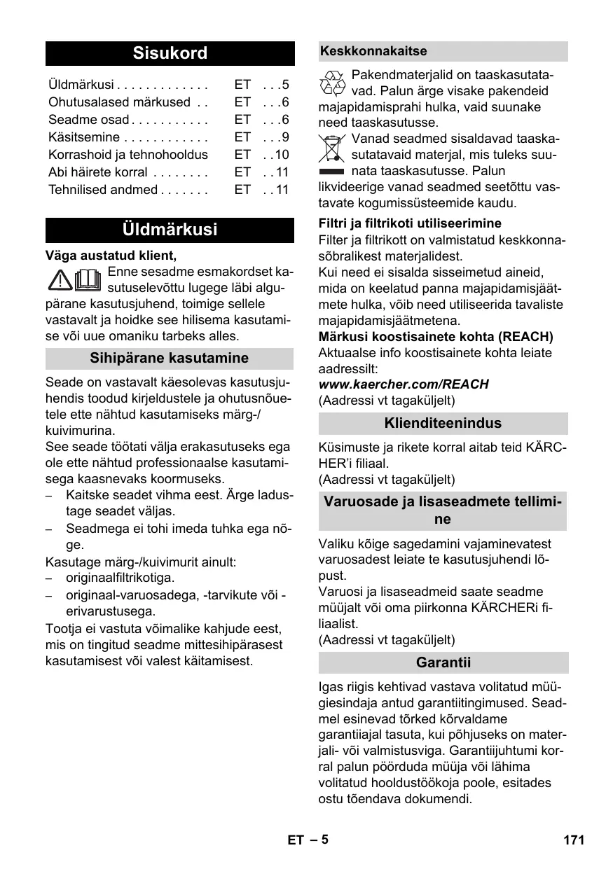 Pakendmaterjalid on taaskasutatavad. Palun ärge visake pakendeid majapidamisprahi hulka, vaid suunake need taaskasutusse. Vanad seadmed sisaldavad taaskasutatavaid materjal, mis tuleks suunata taaskasutusse. Palun likvideerige vanad seadmed seetõttu vastavate kogumissüsteemide kaudu. Filtri ja filtrikoti utiliseerimine Filter ja filtrikott on valmistatud keskkonnasõbralikest materjalidest. Kui need ei sisalda sisseimetud aineid, mida on keelatud panna majapidamisjäätmete hulka, võib need utiliseerida tavaliste majapidamisjäätmetena. Märkusi koostisainete kohta (REACH) Aktuaalse info koostisainete kohta leiate aadressilt: www.kaercher.com/REACH (Aadressi vt tagaküljelt)