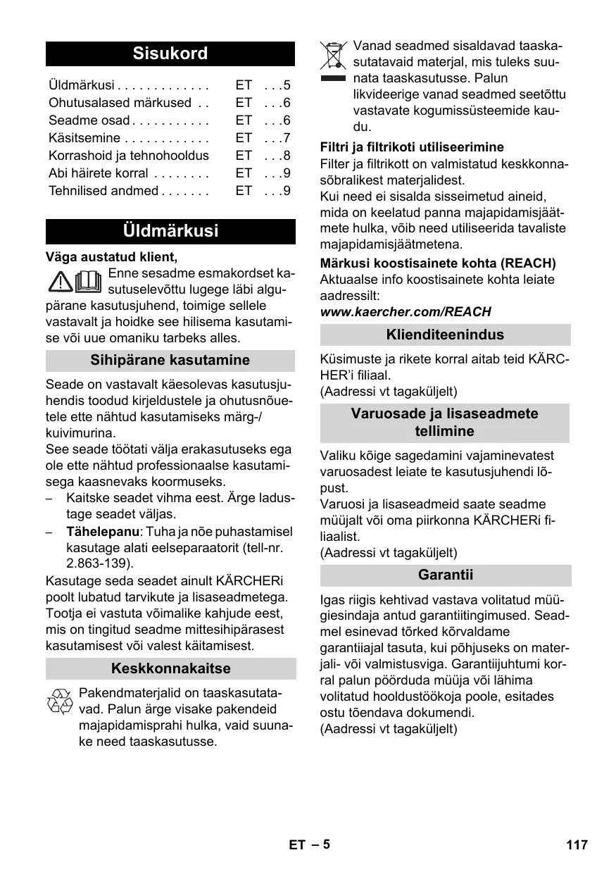 – Protéger l'appareil de la pluie. Ne pas l'entreposer à extérieur. – Attention : en cas d'aspiration de cendre et de suie, utiliser le préséparateur (n° de commande 2.863-139). Seuls des accessoires et des pièces de rechange d’origine autorisés par Kärcher ® doivent être utilisés. Le fabricant décline toute responsabilité en cas de dommages dus à une utilisation non conforme ou incorrecte de l'appareil.
