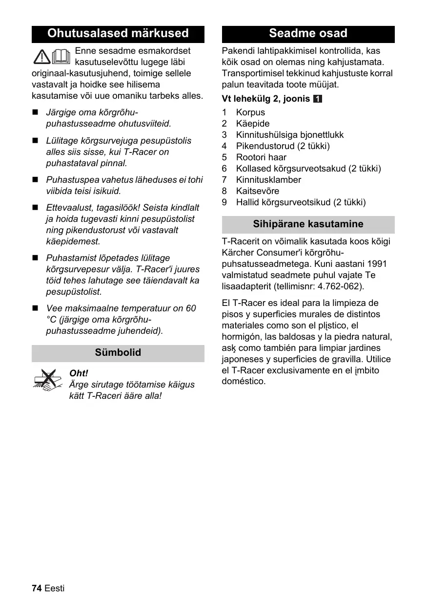 Fijar el T-Racer con los tubos prolongación a la pistola de alta presión. Î Figura 1 Presionar la tubería de prolongación sobre la conexión de bayoneta del TRacer. 2 Después gire 90° hasta que quede encajada. 3 Apretar el manguito de seguridad. – Repetir este proceso también con las dos otras conexiones. Indicaciones sobre la limpieza Para evitar que se dañen las boquillas, hay que limpiar las terrazas con una escoba antes de utilizar el T-Racer. El T-Racer no es apto para fregar ni para frotar. T-Racer a la conexión de la pistola de alta presión. 2 Después gire 90° hasta que quede encajada. 3 Apretar el manguito de seguridad. Precaución Î Figura Bocais de alta pressão cinzentos (2 unidades)